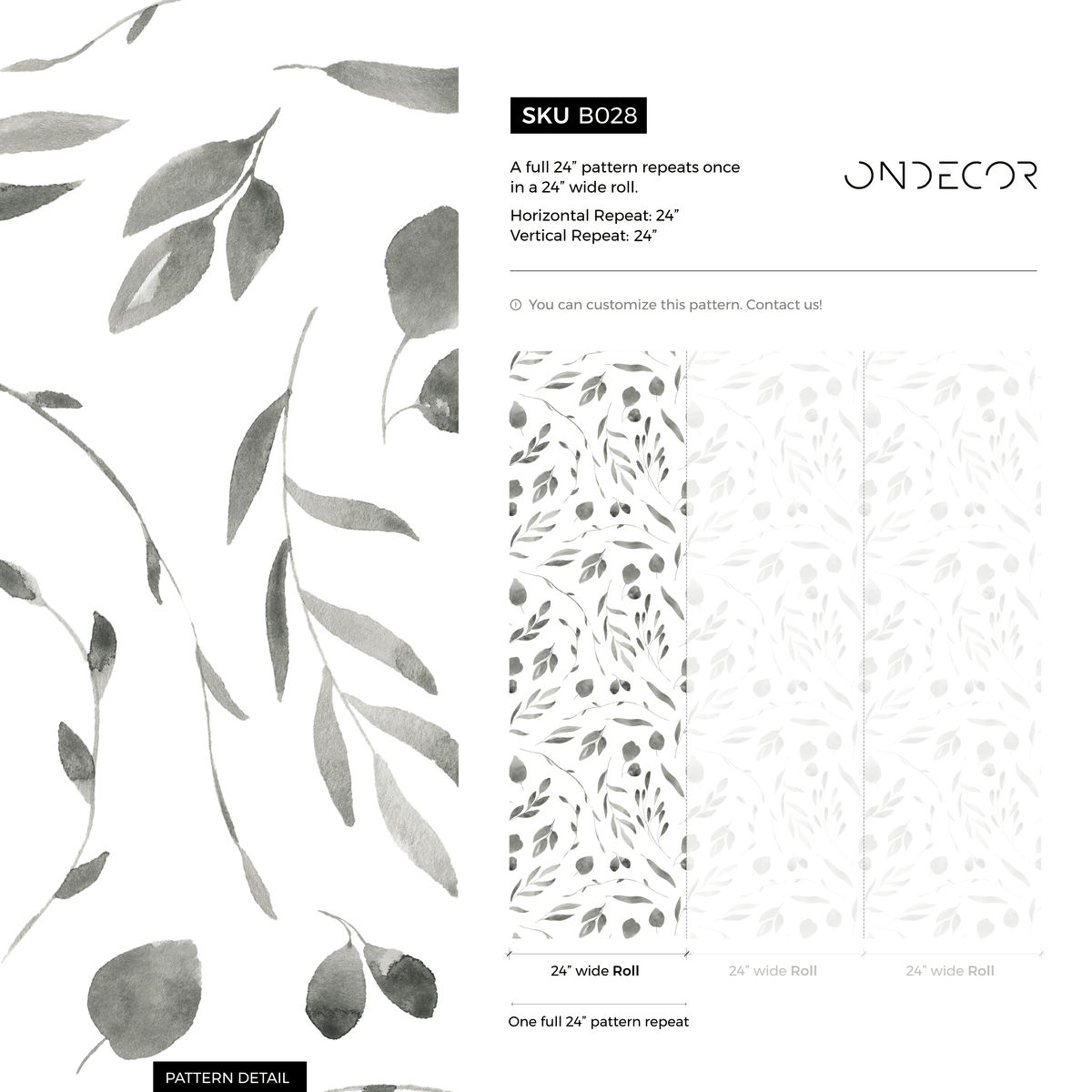 Botanical Wallpaper with a Delicate Watercolor Leaf Motif in Black and Gray - B028