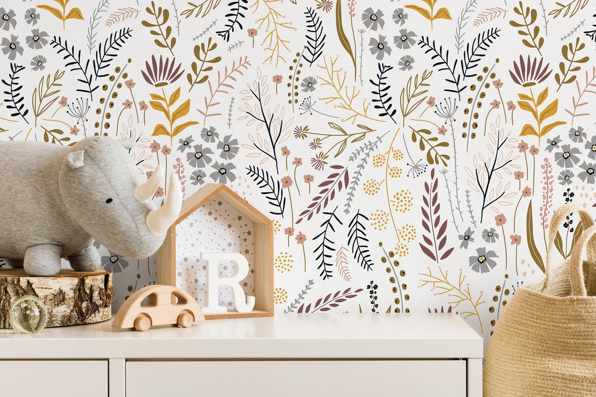 Introduce a touch of nature's charm with our Botanical Wallpaper, featuring a delightful folk art wildflower motif. This captivating wall art, rendered in a warm palette of Mustard, Mauve, and Gray, brings a whimsical yet sophisticated feel to any room. Perfect for creating an accent wall or transforming an entire space, this floral wallpaper is the ideal choice for enhancing your home decor with a unique, hand-drawn aesthetic.