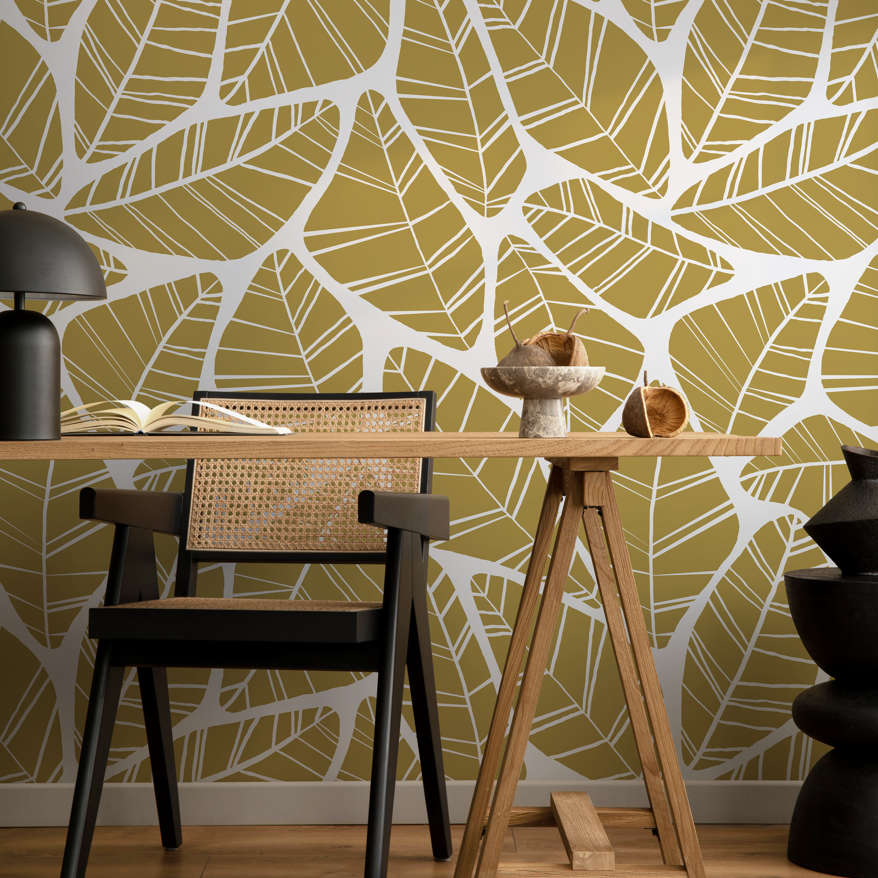 Introduce a bold, natural element into your space with this Botanical Wallpaper, featuring a graphic leaf motif. The striking design showcases large, stylized leaves in a sophisticated mustard and white palette, creating a modern yet organic statement. This wallpaper is perfect for anyone looking to infuse their home decor with contemporary botanical art, instantly transforming a plain wall into a captivating focal point. Ideal for creating an accent wall or decorating a full room, this wall art brings a vibrant and stylish energy to any interior design scheme.