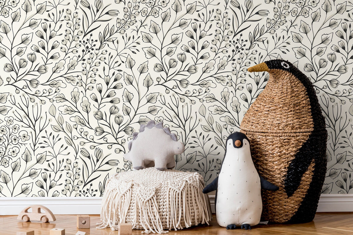 Introduce a touch of serene elegance to your home with our Botanical Wallpaper, featuring a delicate, hand-drawn wildflower motif. This sophisticated design showcases intricate florals, leaves, and berries in classic black and gray, creating a timeless piece of wall art that complements any interior design. Perfect for crafting a stunning accent wall or enveloping an entire room, this wallpaper brings a calm, organic feel to your space, transforming it into a stylish sanctuary.