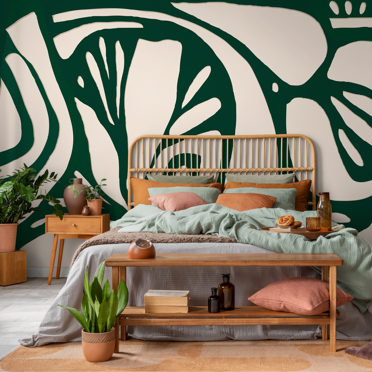 Elevate your interior design with this stunning Botanical Wallpaper, featuring a large abstract leaf motif. The bold design, rendered in a striking combination of deep Dark Green and soft Beige, creates a sophisticated and modern focal point. This mural serves as captivating wall art, perfect for anyone looking to infuse their home decor with a touch of organic minimalism.