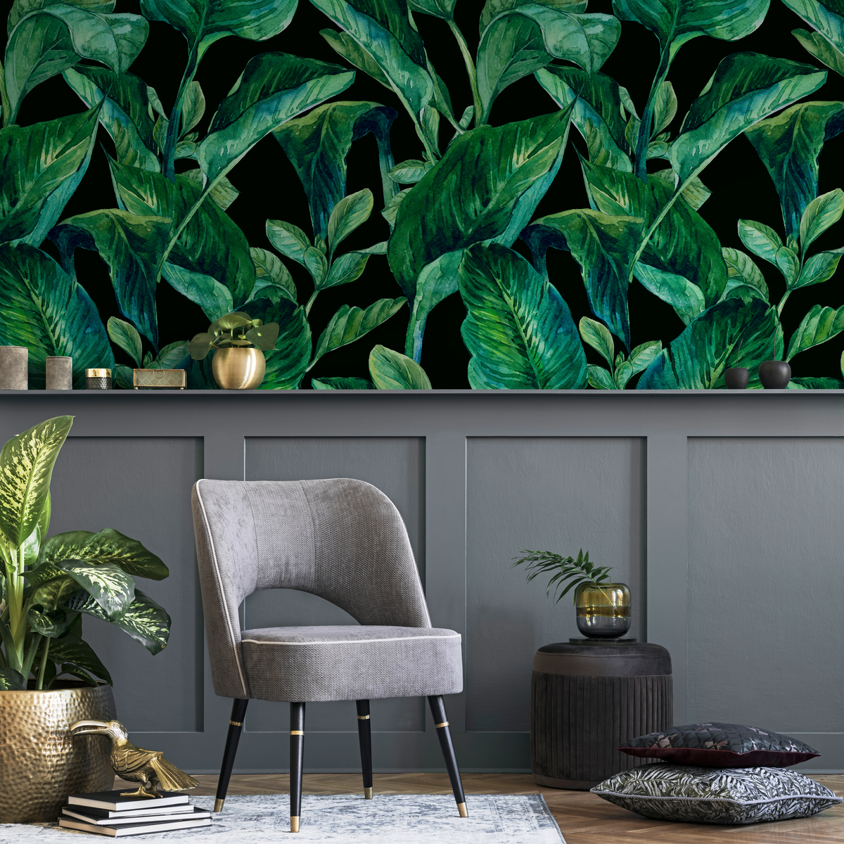Immerse your space in the dramatic beauty of our Botanical Wallpaper, featuring lush watercolor leaves in rich shades of green against a bold black background. This stunning wall decor brings a touch of the tropical jungle indoors, creating a sophisticated and moody atmosphere. Perfect for a statement accent wall, this design transforms any room into a luxurious retreat, making it a standout piece of wall art for elevated interior design.
