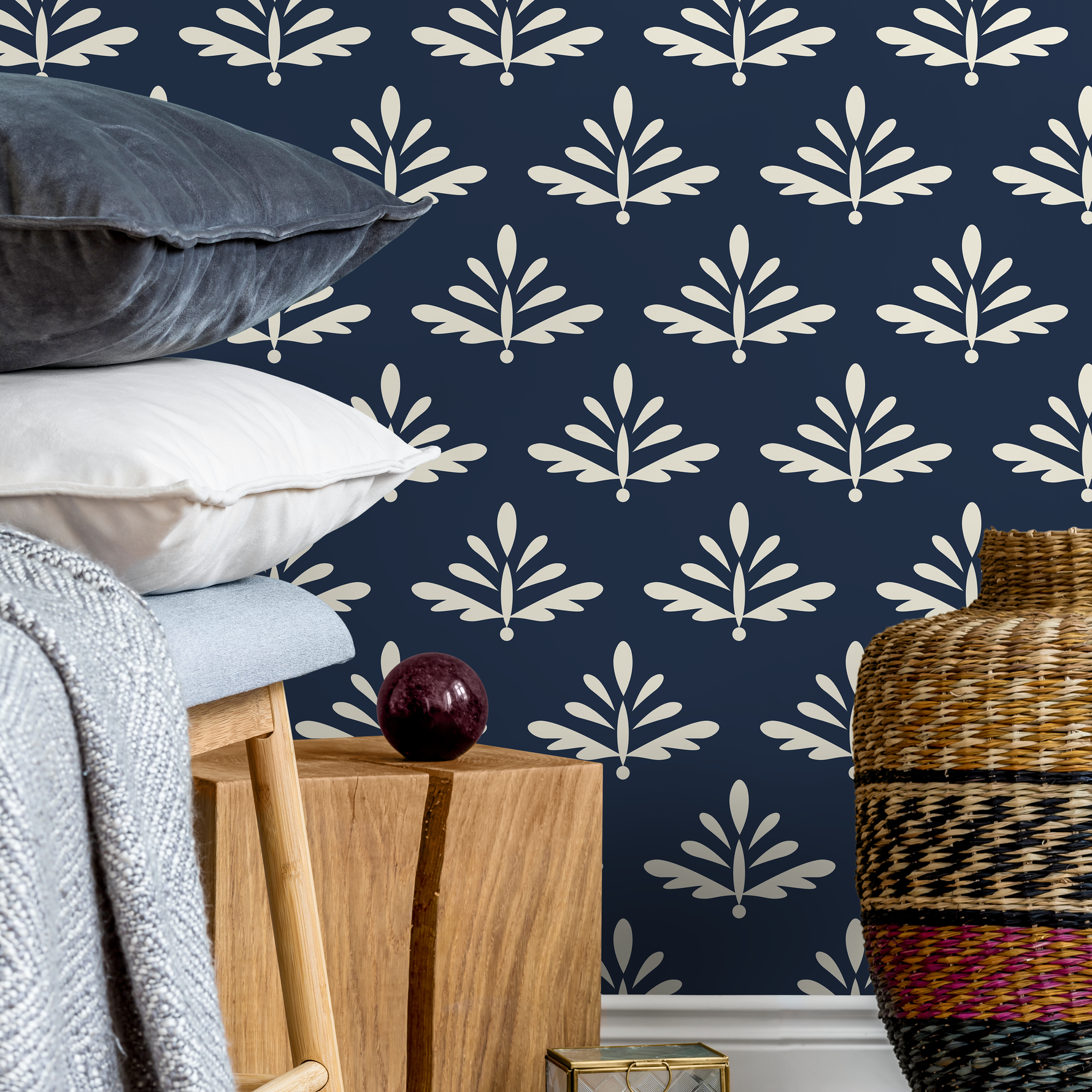 Introduce timeless elegance to your home with our stunning Botanical Wallpaper, featuring a stylized foliage motif in a sophisticated palette of Navy Blue and Cream. This Scandinavian-inspired design brings a clean, modern aesthetic to any space, making it the perfect choice for creating a serene and stylish atmosphere. The repeating pattern offers a classic yet contemporary feel, ideal for transforming your interior design into a work of art.