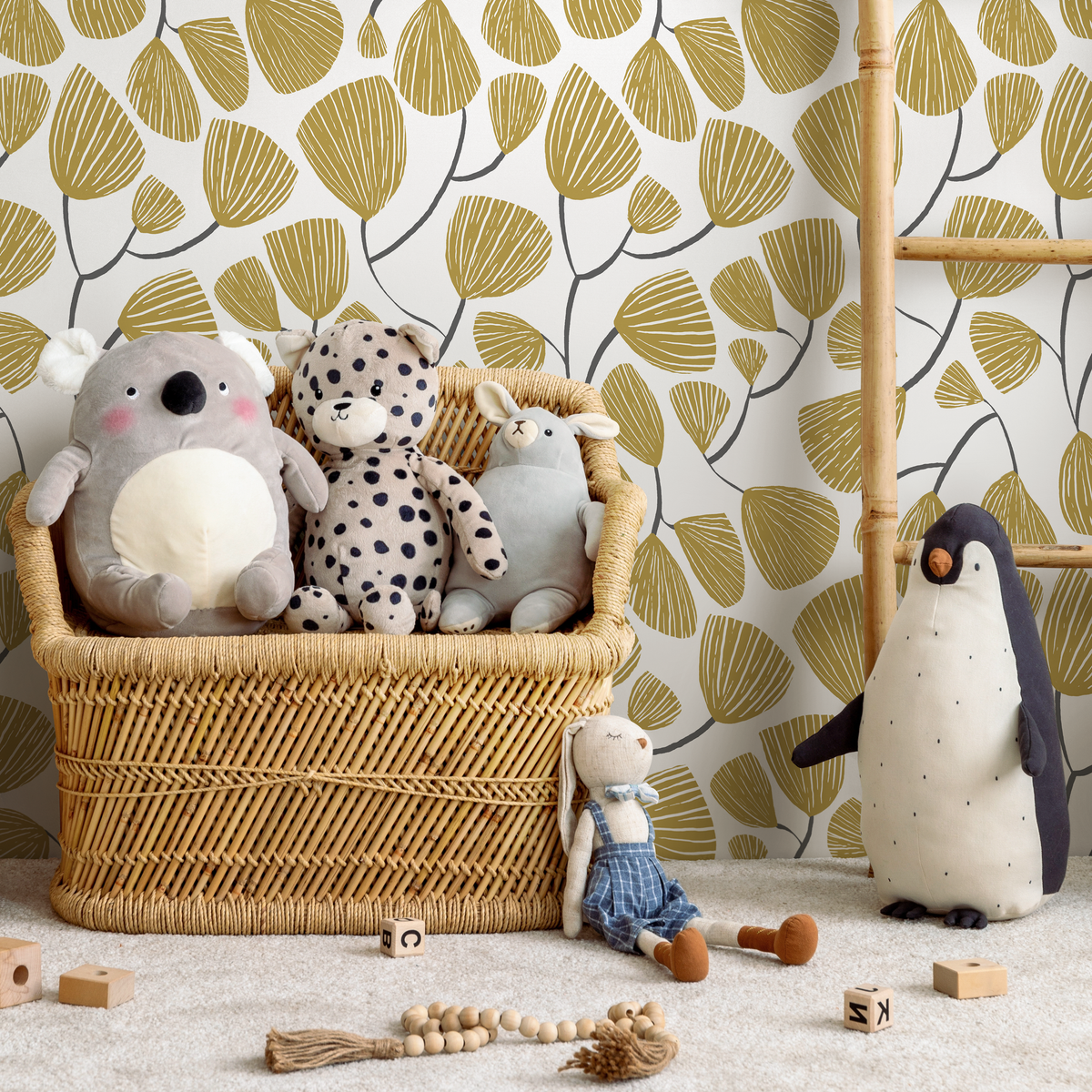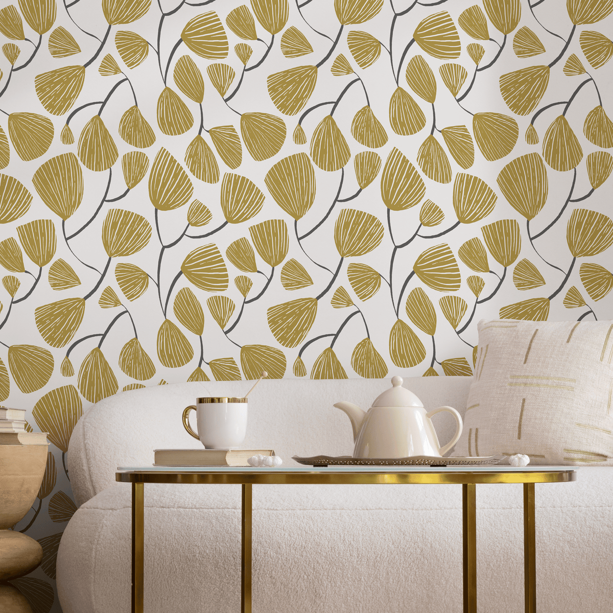 Infuse your home with natural elegance using this stunning Botanical Wallpaper. Featuring a sophisticated pattern of stylized ginkgo leaves, this design brings a modern, artistic touch to any room. The beautiful interplay of warm yellow and grounding gray creates a balanced and inviting atmosphere, making it the perfect wall art to elevate your home decor.