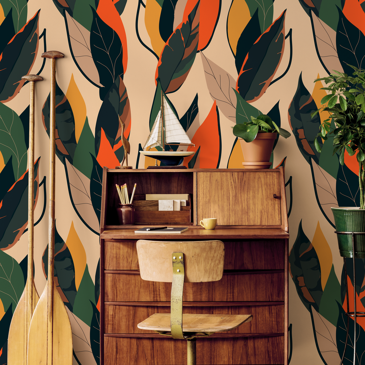 Introduce a bold, natural element to your home with our stunning Botanical Wallpaper. This design features an abstract pattern of stylized leaves in a sophisticated palette of deep green, vibrant orange, and warm yellow, set against a soft beige background. This modern wall art is perfect for creating a captivating focal point, instantly elevating your interior design with its dynamic and artistic composition. The rich colors and graphic leaf shapes bring energy and style to any room, making it a standout choice for contemporary home decor.