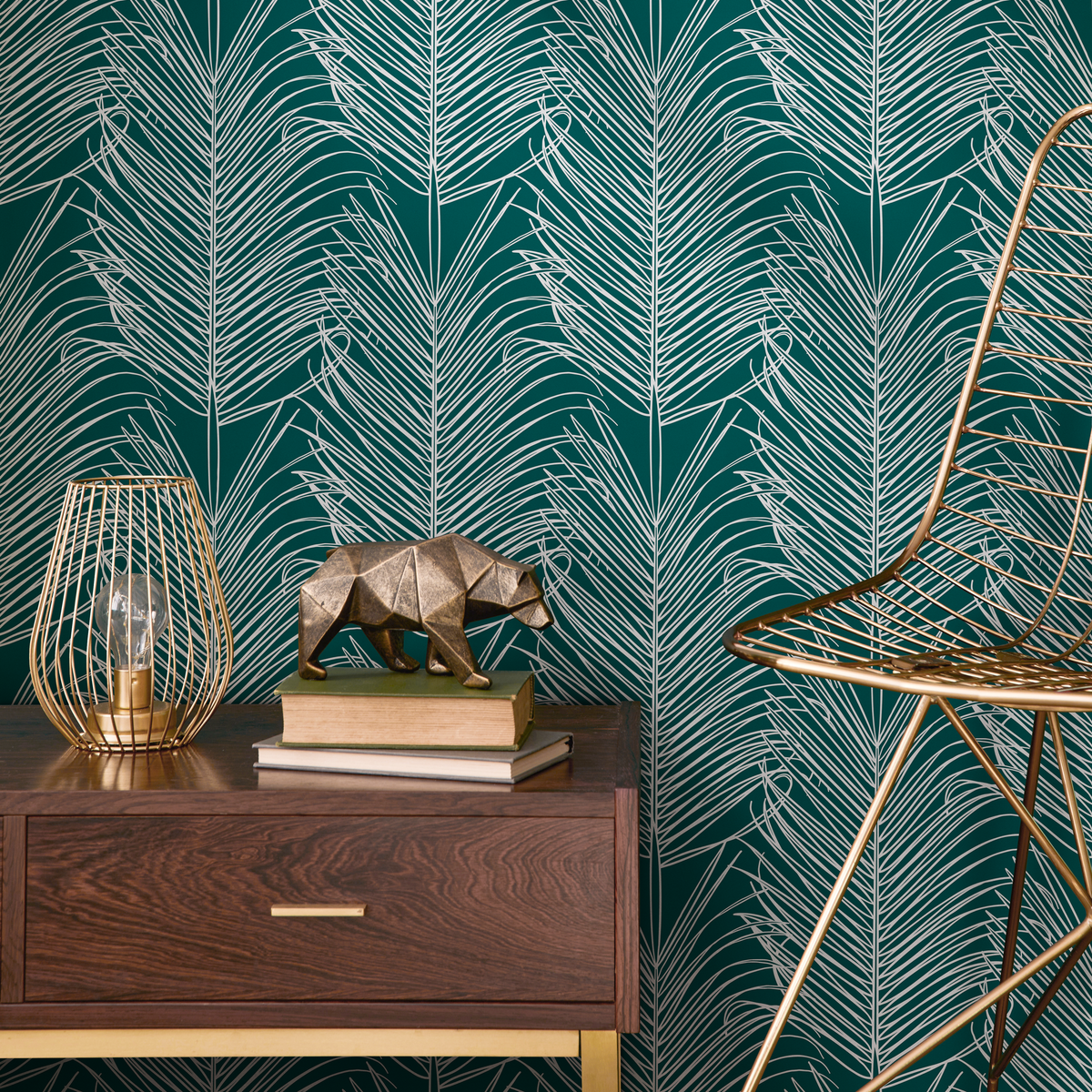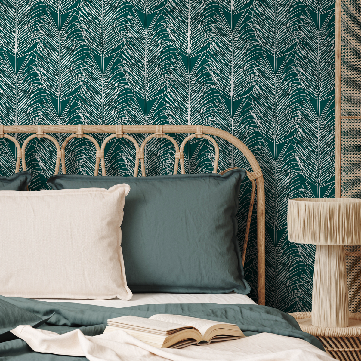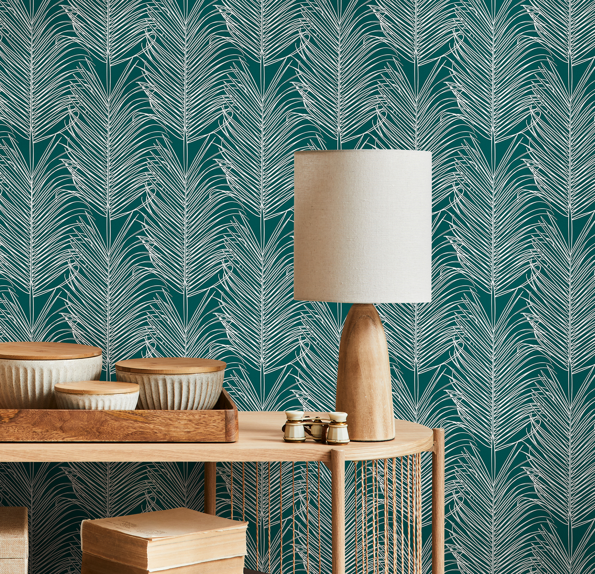 Elevate your interior design with our stunning Botanical Wallpaper, featuring a sophisticated pattern of stylized palm fronds. This elegant wall art, presented in a striking Teal and White color palette, offers a modern take on tropical home decor. It's the perfect choice for creating a chic and serene atmosphere in any room.