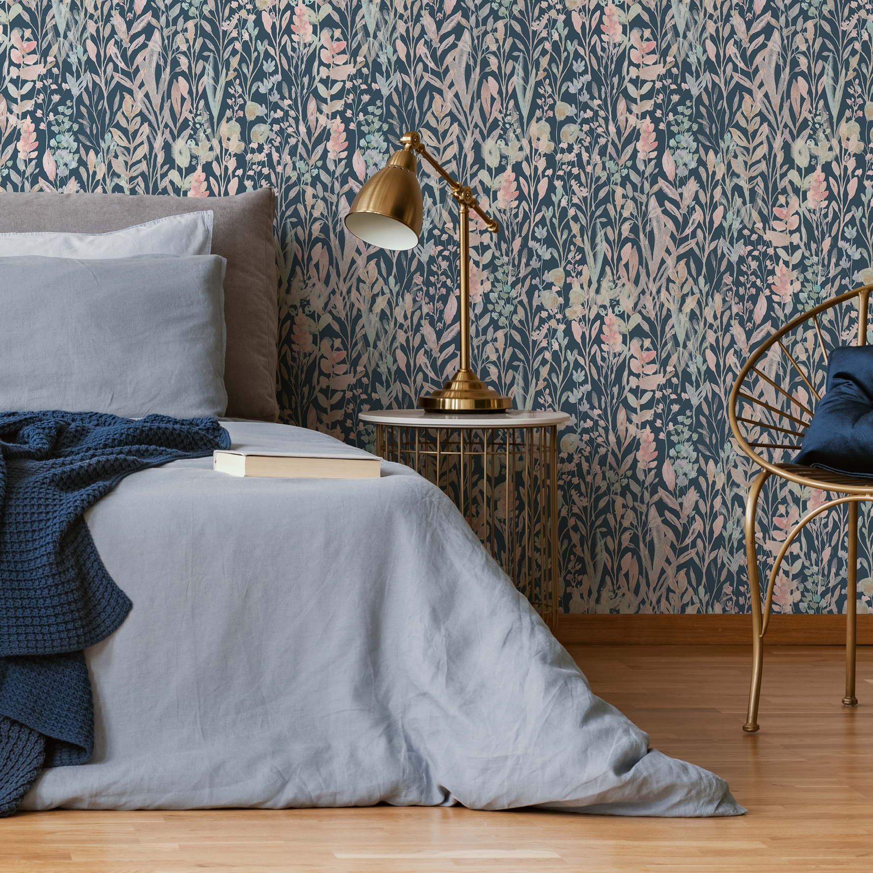 Introduce a touch of sophisticated nature to your home with our Botanical Wallpaper, featuring a delicate wildflower motif. This captivating design showcases an intricate pattern of leaves and blossoms in soft pink and light blue, set against a rich, dark blue background, creating a moody yet elegant atmosphere. Perfect for creating a stunning accent wall or enveloping an entire room, this wall art brings organic beauty to your interior design. Our peel and stick wallpaper makes transforming your space simple and stress-free. Designed for easy installation, this removable wallpaper is a favorite for home decor enthusiasts and renters alike, as it can be applied and removed without damaging walls. Use this botanical wallpaper for a bedroom refresh, to add character to a living room, or to create a unique dining space. It's the ideal solution for a quick and impactful style enhancement. Crafted with superior quality in mind, our wallpaper is made in the USA using eco-friendly, non-toxic inks. The advanced printing technology ensures sharp, high-quality images with exceptional color consistency and scratch resistance. Enjoy a durable, long-lasting design that is safe for your family and easy to maintain, bringing premium, sustainable style into your home.