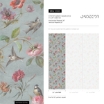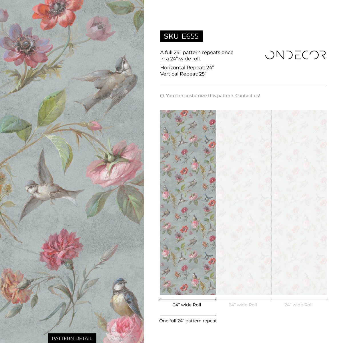 Botanical Wallpaper with Vintage Birds and Flowers in Blue, Pink, and Red - E655
