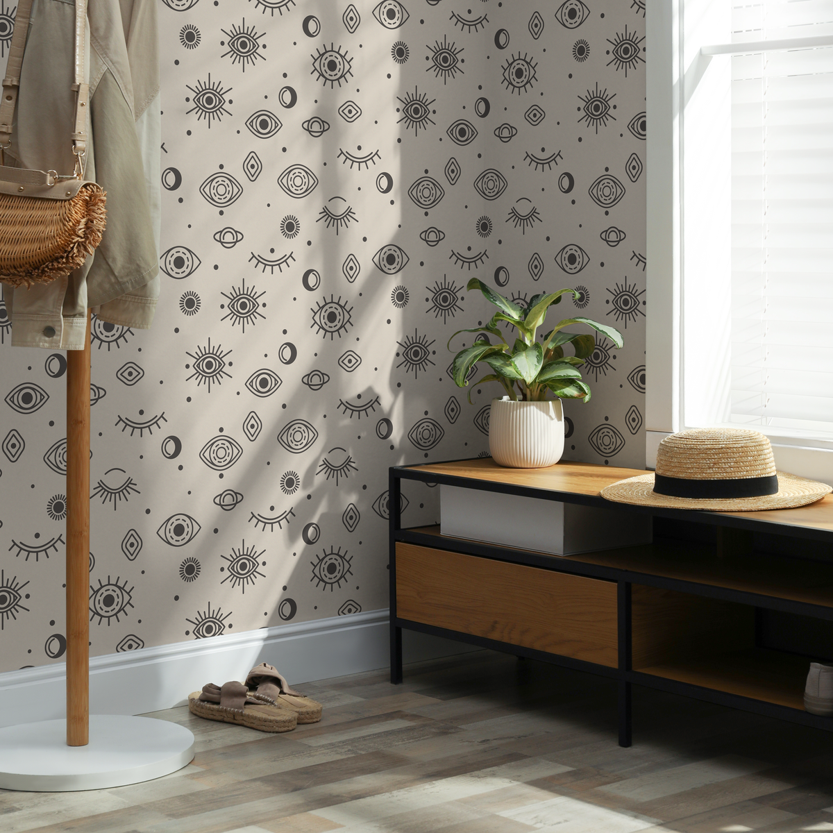 Introduce a touch of mystique to your home with our Celestial Wallpaper, featuring an intricate pattern of mystical eye and moon motifs. This captivating design, presented in a sophisticated charcoal and beige color palette, is perfect for creating a serene and spiritual atmosphere. The unique arrangement of celestial symbols makes this wallpaper an ideal choice for a striking accent wall or for enveloping an entire room in its enchanting design, instantly elevating your interior design with a bohemian flair.
