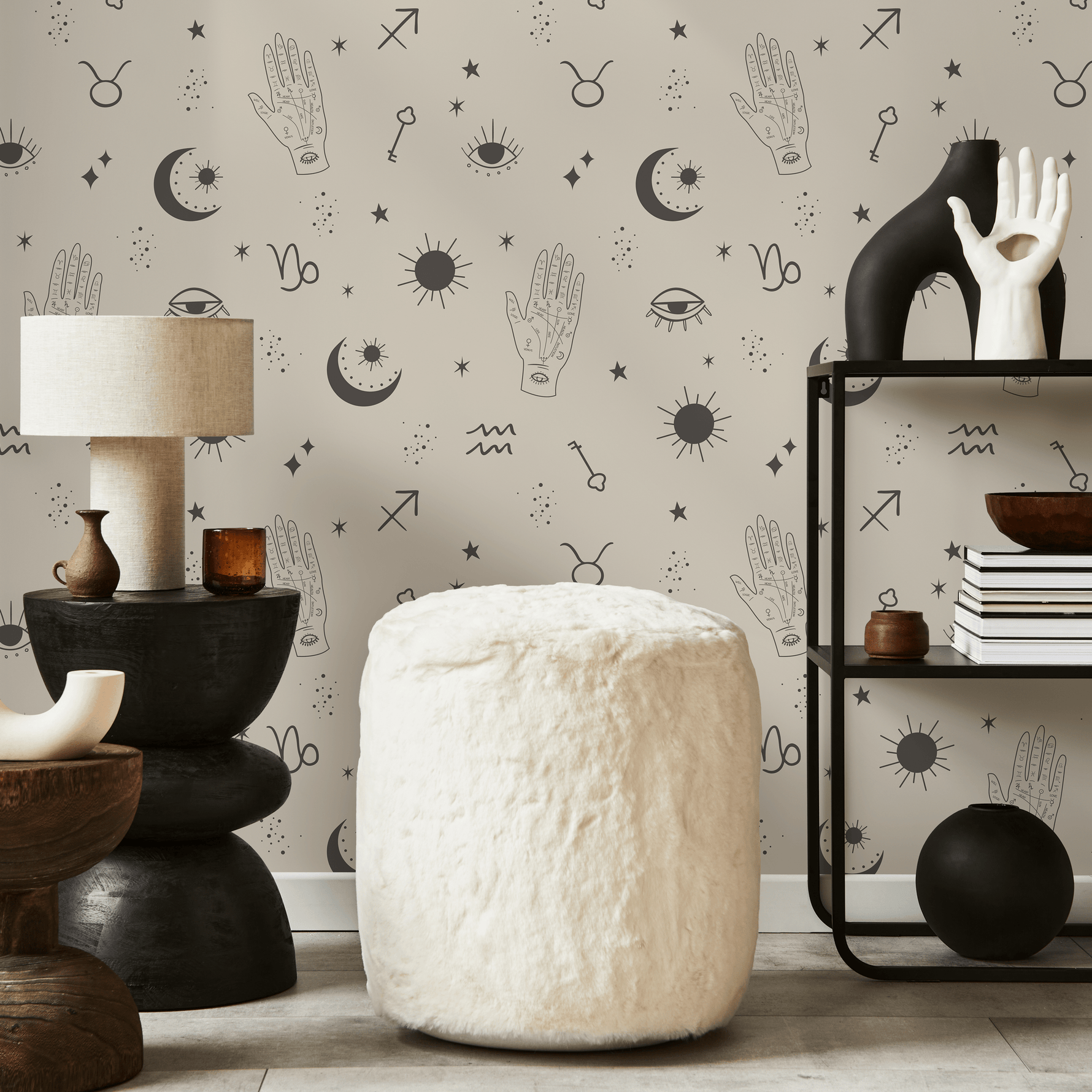 Introduce a touch of cosmic wonder to your home with our Celestial Wallpaper, rendered in a sophisticated charcoal and beige palette. This captivating wall art features an intricate pattern of zodiac signs, mystical palmistry hands, and celestial symbols like moons and suns, perfect for creating an atmosphere of mystique and personal expression. This design serves as a stunning backdrop that elevates your interior design, turning any plain wall into a conversation-starting masterpiece.