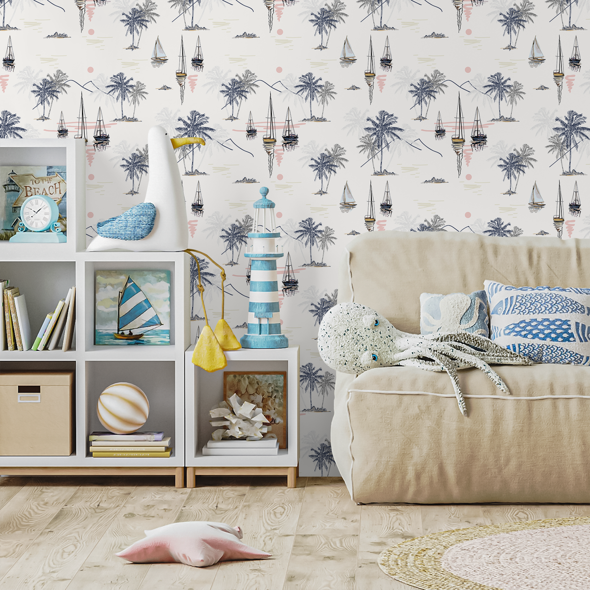 Drift away to a serene seaside escape with our Coastal Wallpaper, a perfect choice for creating a tranquil and stylish atmosphere in your home. This charming design features a repeating pattern of sailboats and palm trees, rendered in a soothing palette of Navy Blue, Beige, and Pink. This illustrative wall art captures the essence of a breezy beach day, making it an ideal addition to any interior design seeking a touch of nautical elegance and tropical calm.