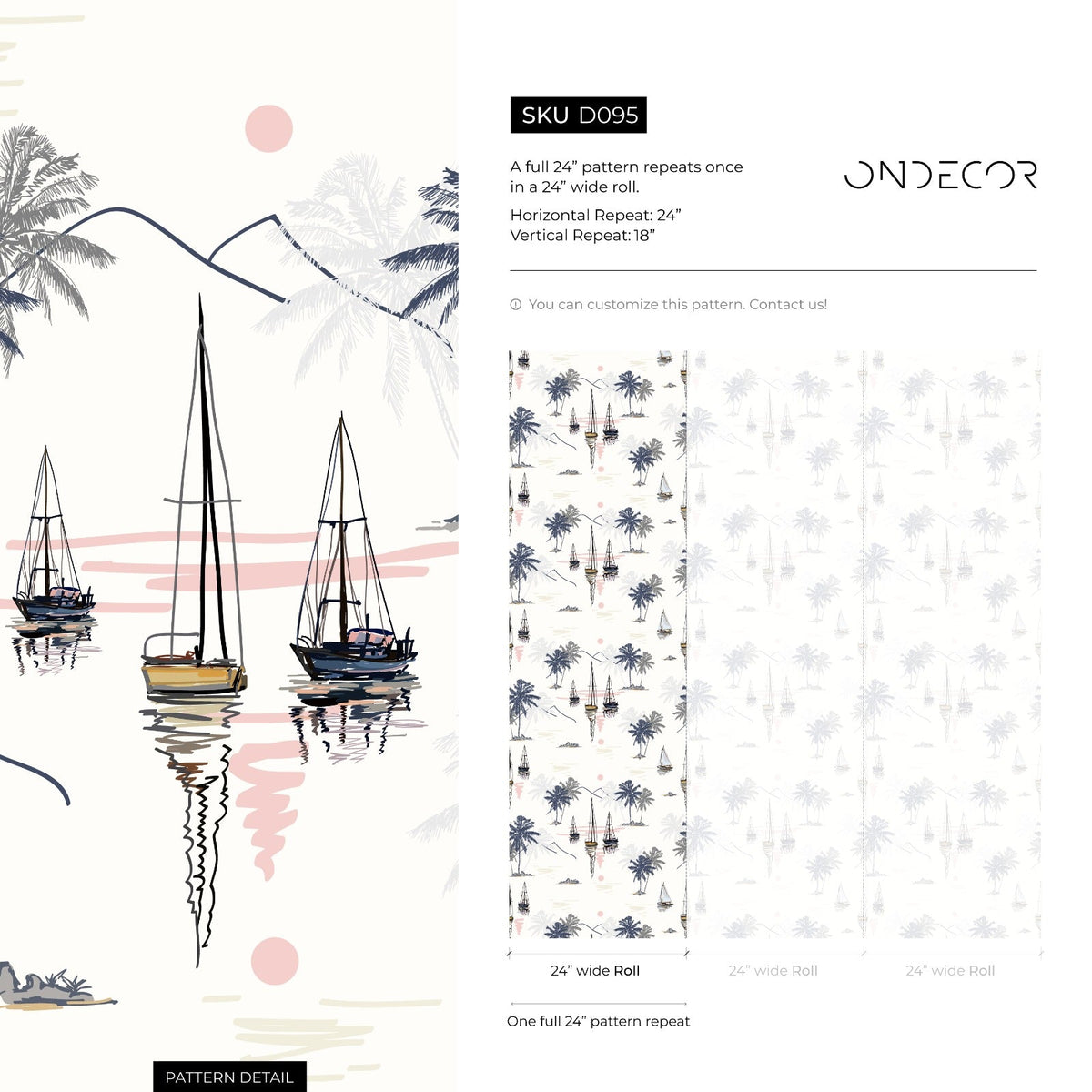 Coastal Wallpaper Featuring Sailboats and Palm Trees in Navy Blue, Beige, and Pink - D095