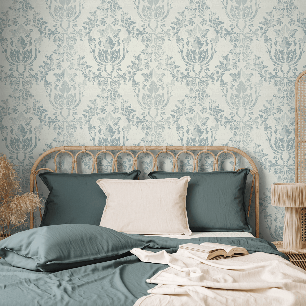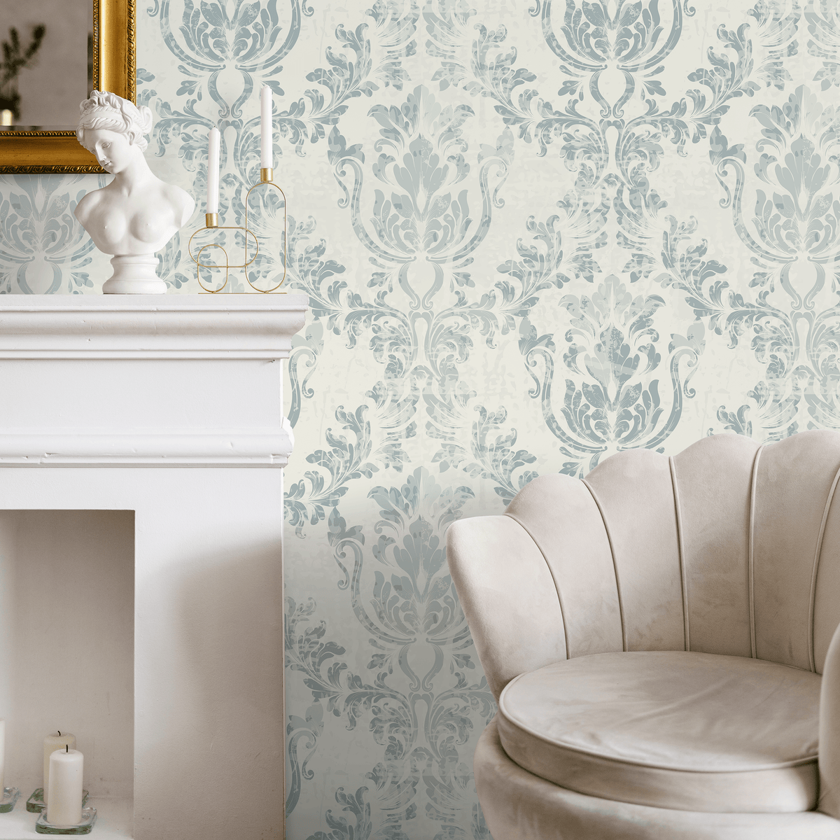 Introduce timeless elegance to your home with our Damask Wallpaper with a Distressed Motif in Blue and Cream. This stunning wall art instantly elevates any interior design, adding a touch of vintage charm and sophistication. The classic damask pattern, rendered in soft blue and cream tones with a weathered texture, creates a serene and inviting atmosphere perfect for a classic home decor aesthetic.