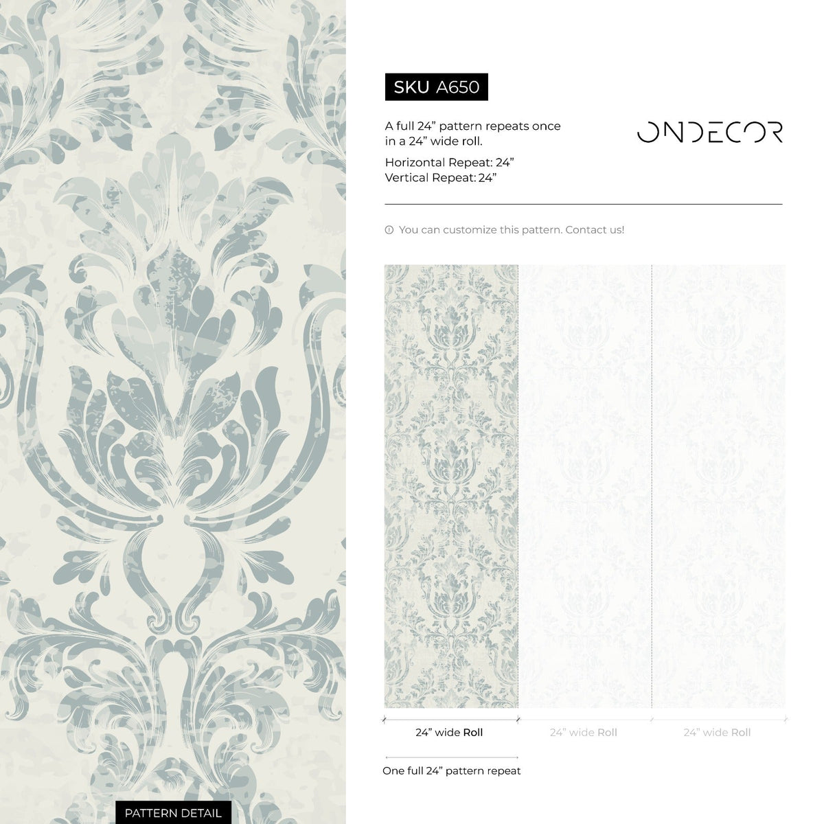 Damask Wallpaper with a Distressed Motif in Blue and Cream - A650