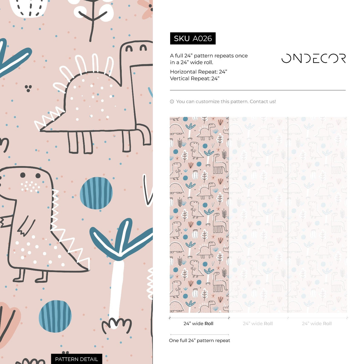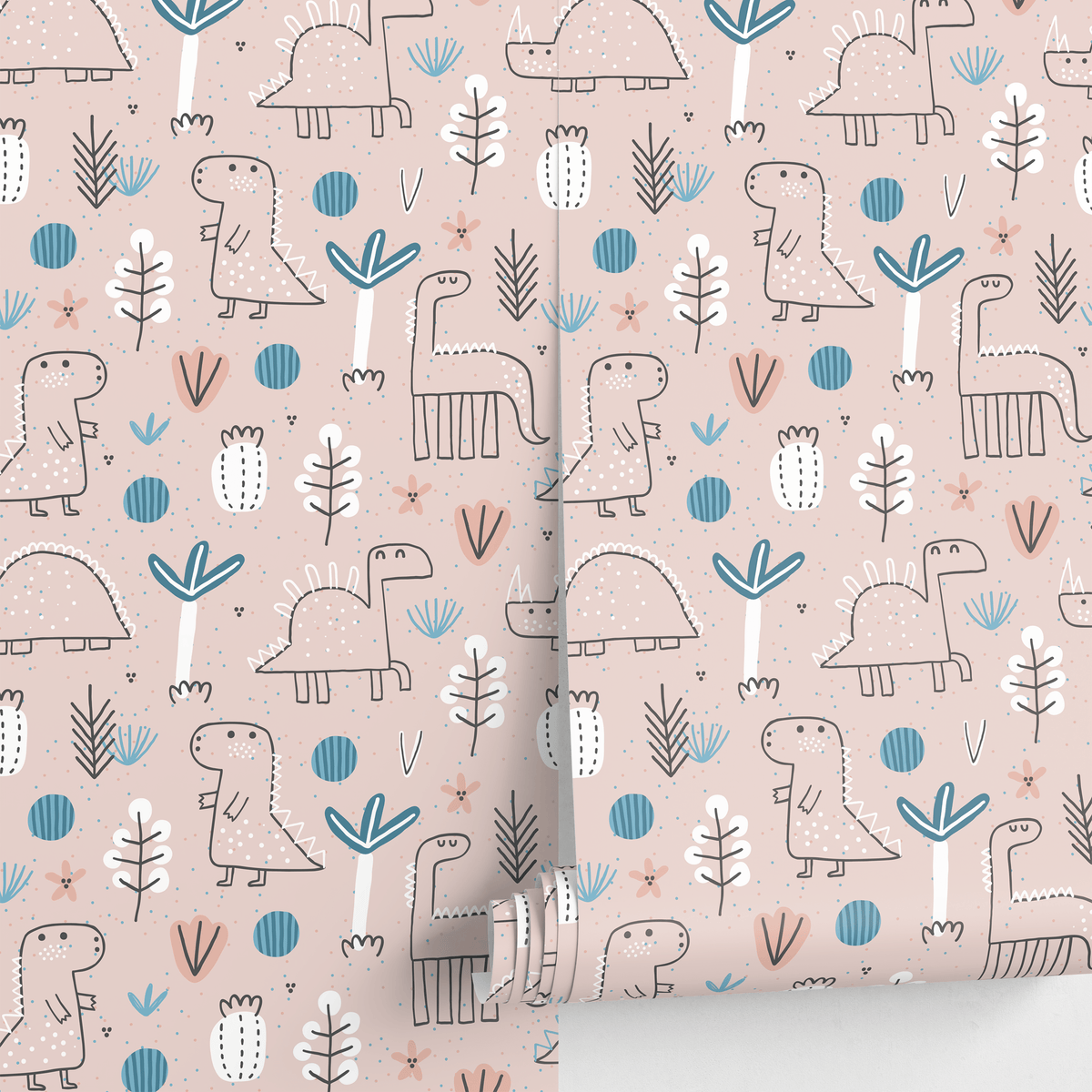 Introduce a world of playful prehistoric fun with our Dinosaur Wallpaper, featuring a charming hand-drawn design. The delightful pattern of friendly dinos and stylized plants in soft pink, blue, and black creates a gentle yet engaging atmosphere perfect for any child's space. This Scandinavian-inspired wall art is ideal for a nursery accent wall, a full bedroom makeover, or bringing a touch of whimsy to a playroom, making it a wonderful piece of home decor.