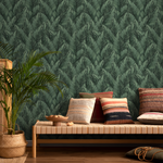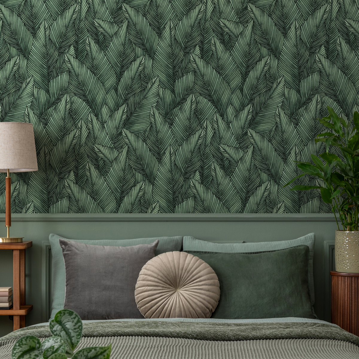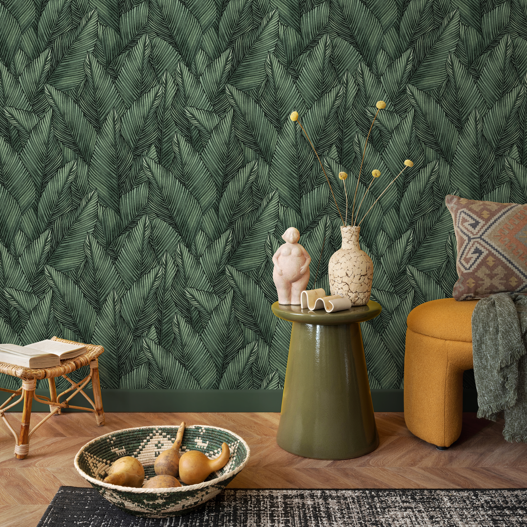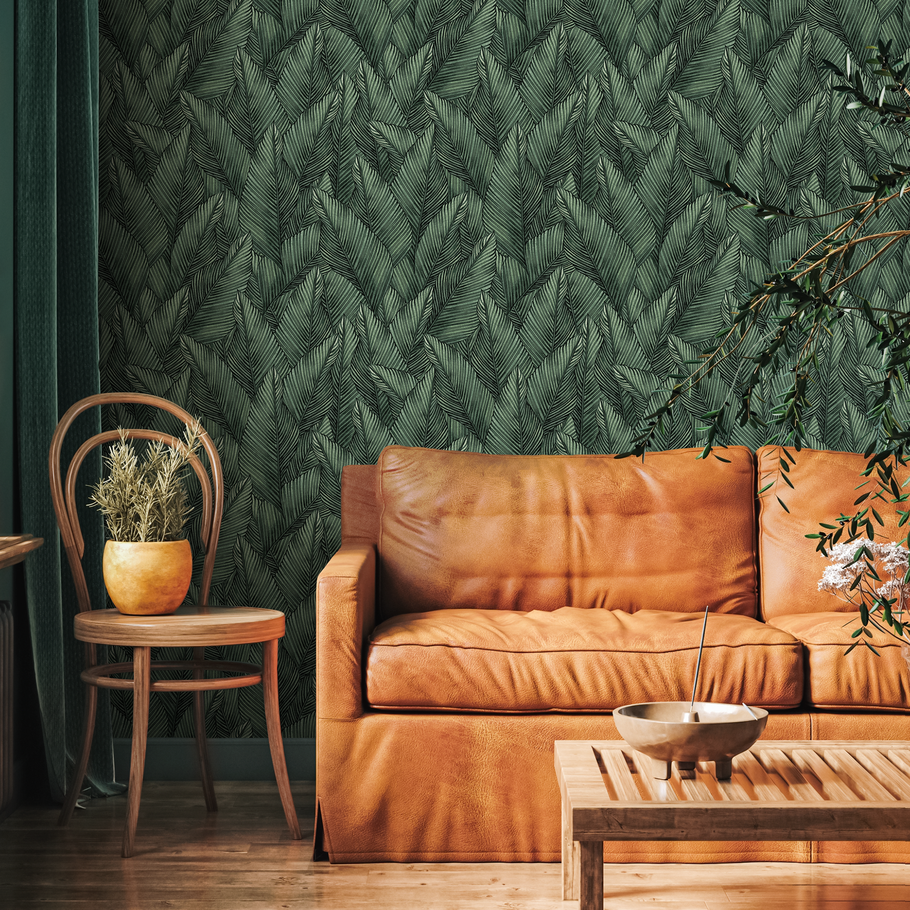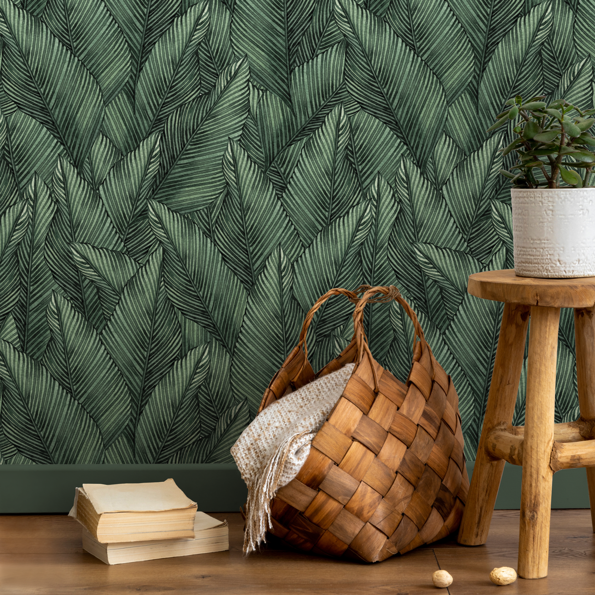 Immerse your space in the lush tranquility of nature with this exquisite Botanical Wallpaper. Featuring a captivating design of layered striped leaves in rich shades of green and black, this wall art brings a sophisticated and organic touch to any room. Perfect for creating a dramatic accent wall, this wallpaper effortlessly enhances your interior design, making it feel like a verdant retreat.