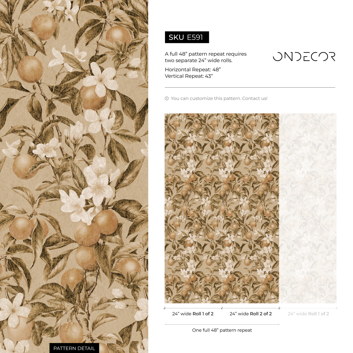 Refresh your interior with our stunning Botanical Wallpaper, featuring a timeless design of vintage orange branches. The warm and inviting pattern, rendered in rich shades of brown, orange, and cream, brings a touch of rustic elegance to any room. This vintage-inspired wallpaper is perfect for creating a sophisticated accent wall or transforming an entire space with its charming orange grove motif, making it an excellent choice for those seeking classic wall art with a natural touch.