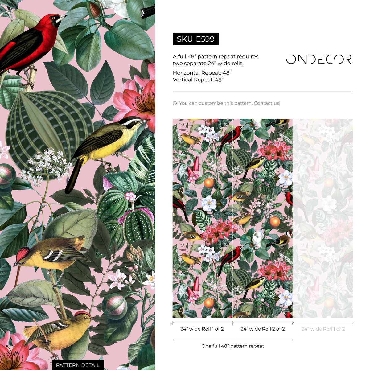 Immerse your space in the lush beauty of our Botanical Wallpaper, a vintage-inspired design featuring exotic birds and vibrant tropical flowers. This captivating wall art brings a touch of nature's elegance indoors, with a stunning composition of red and yellow birds perched among rich green foliage, blooming florals, and ripe fruits, all set against a soft pink background. Perfect for creating a dramatic accent wall, this wallpaper transforms any room into a sophisticated and exotic sanctuary.