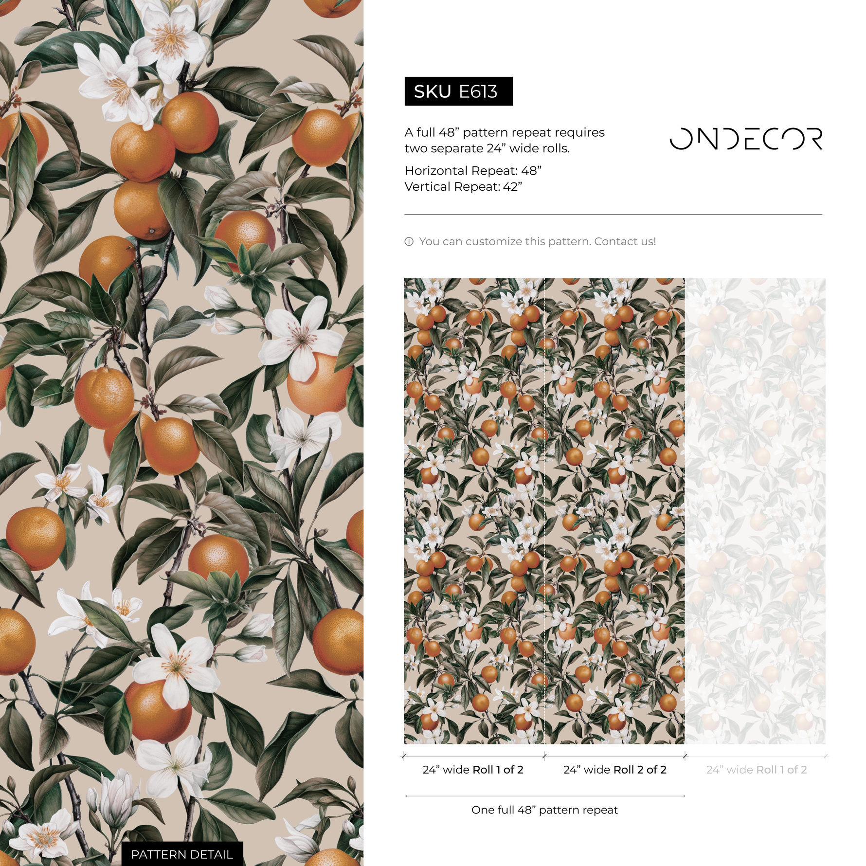 Refresh your space with our exquisite Botanical Wallpaper, showcasing a stunning design of orange trees laden with fruit and delicate white blossoms. This elegant wallpaper, featuring rich shades of orange, green, and white against a soft beige background, brings a touch of Mediterranean charm and natural beauty to any room. Perfect for creating a vibrant accent wall or transforming an entire space, this design adds a sophisticated and organic feel to your home decor.