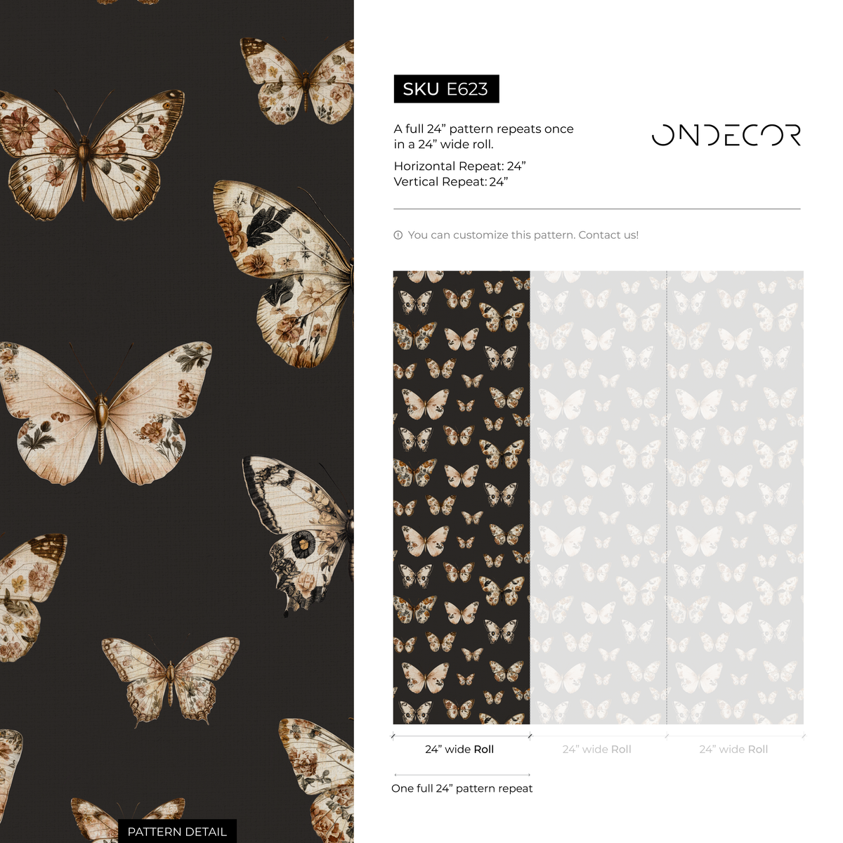 Introduce a touch of vintage elegance to your home with our stunning Botanical Wallpaper. This exquisite design features an array of vintage floral butterflies, each intricately detailed with delicate flower patterns on their wings. Set against a deep, dramatic black background, the beautiful illustrations in soft brown and beige tones create a captivating and moody atmosphere, perfect for a sophisticated interior design.