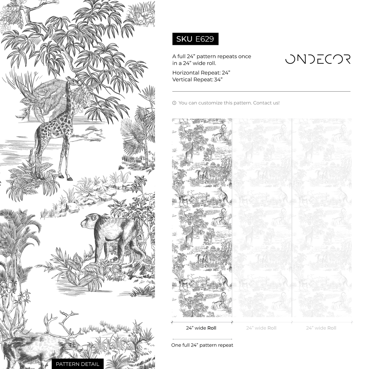 Toile Wallpaper Featuring Safari and Forest Animals in Black and White - E629