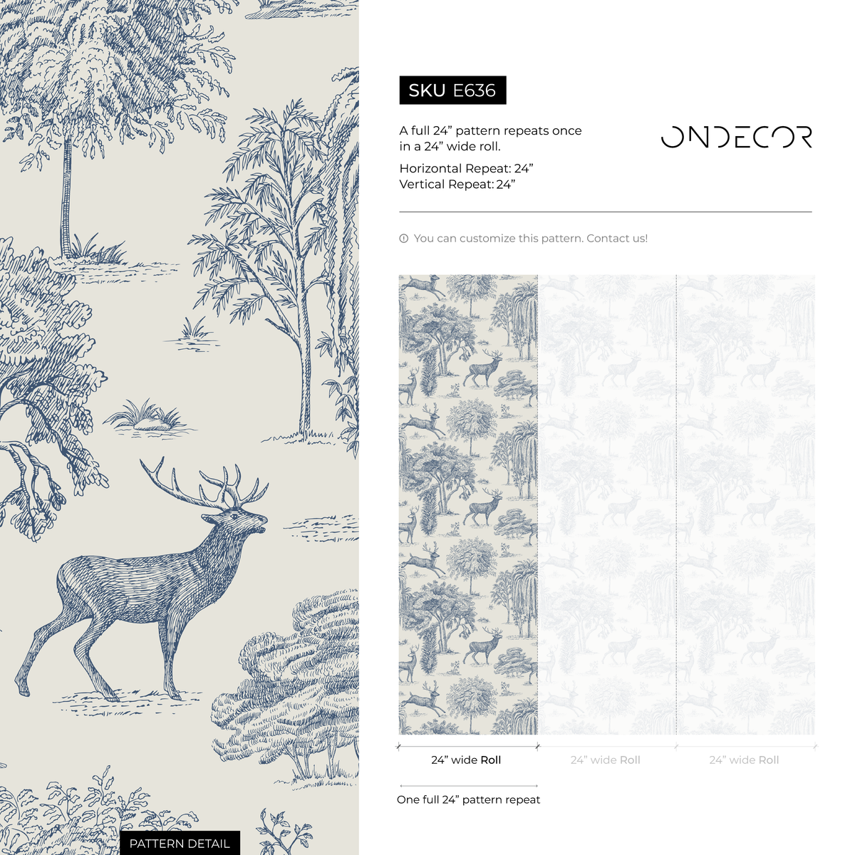 Crafted from premium materials, this blue wallpaper ensures a seamless application and a professional look. The intricate, hand-drawn style of the deer and forest scene offers a unique and artistic touch, making it more than just wallpaper—it's a statement piece. Embrace the classic appeal of Toile wallpaper for your home and create a peaceful retreat you'll love for years to come.