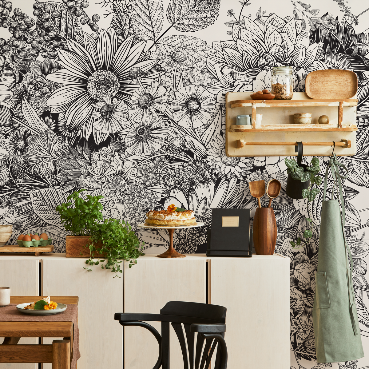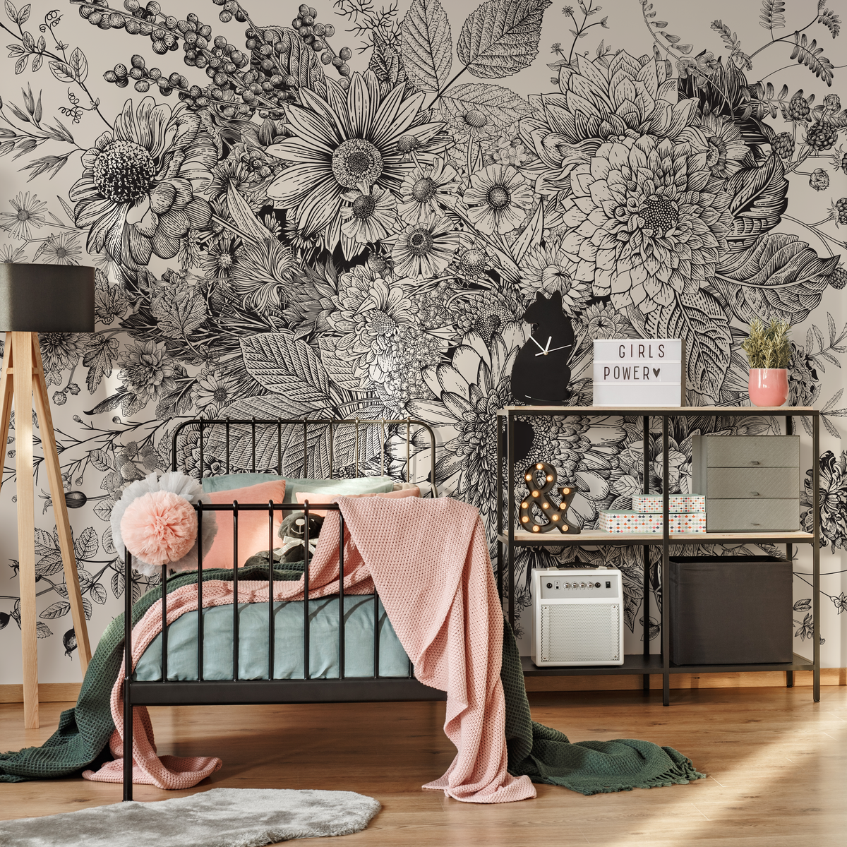 Redefine your interior with this captivating Floral Wallpaper, featuring a detailed botanical sketch in a timeless black and white color palette. This large-scale mural transforms any room into a sophisticated work of art, perfect for creating an elegant and modern atmosphere. The intricate line art, showcasing a dense bouquet of dahlias, sunflowers, and other blooms, brings a touch of nature-inspired beauty to your home decor, making it an ideal choice for a statement accent wall.
