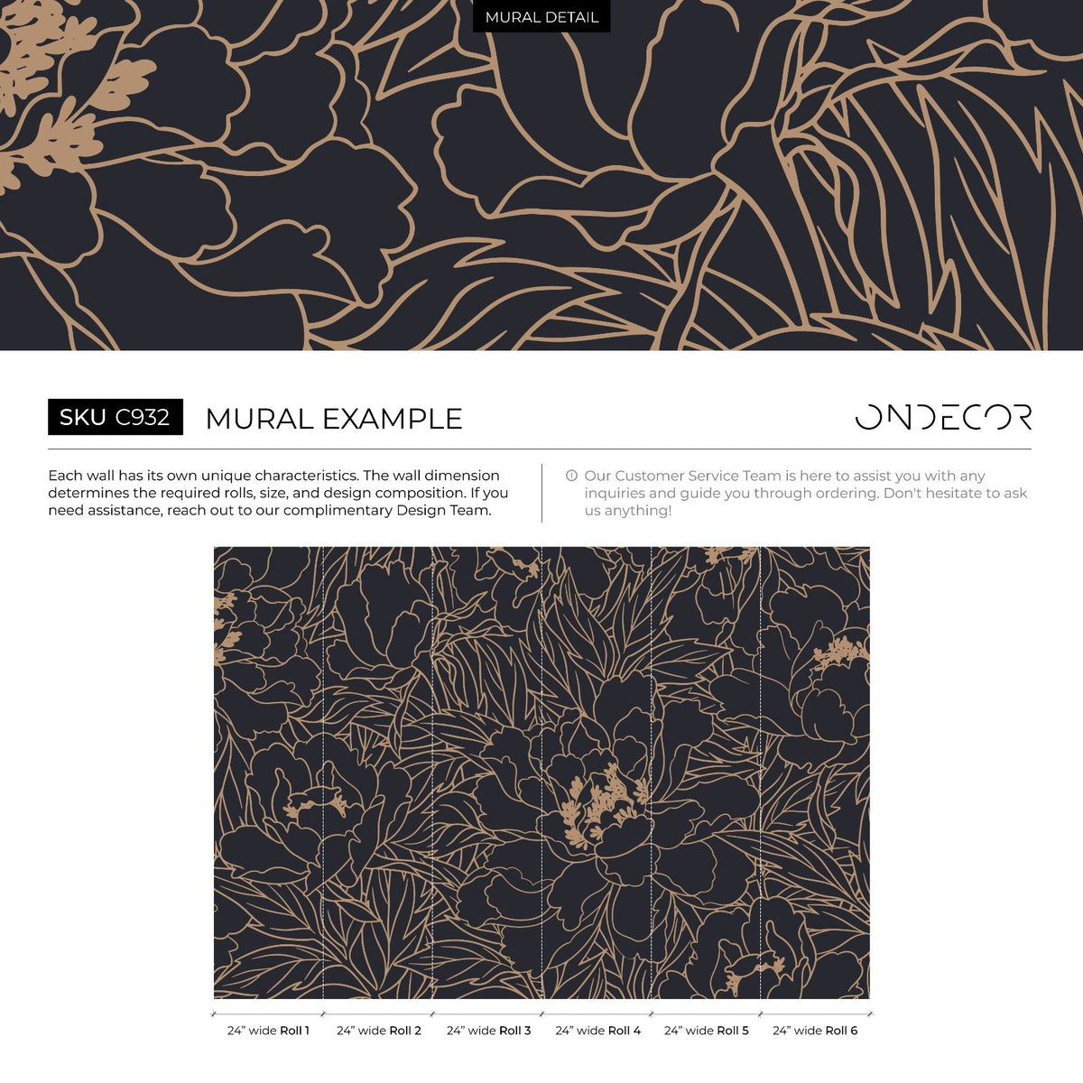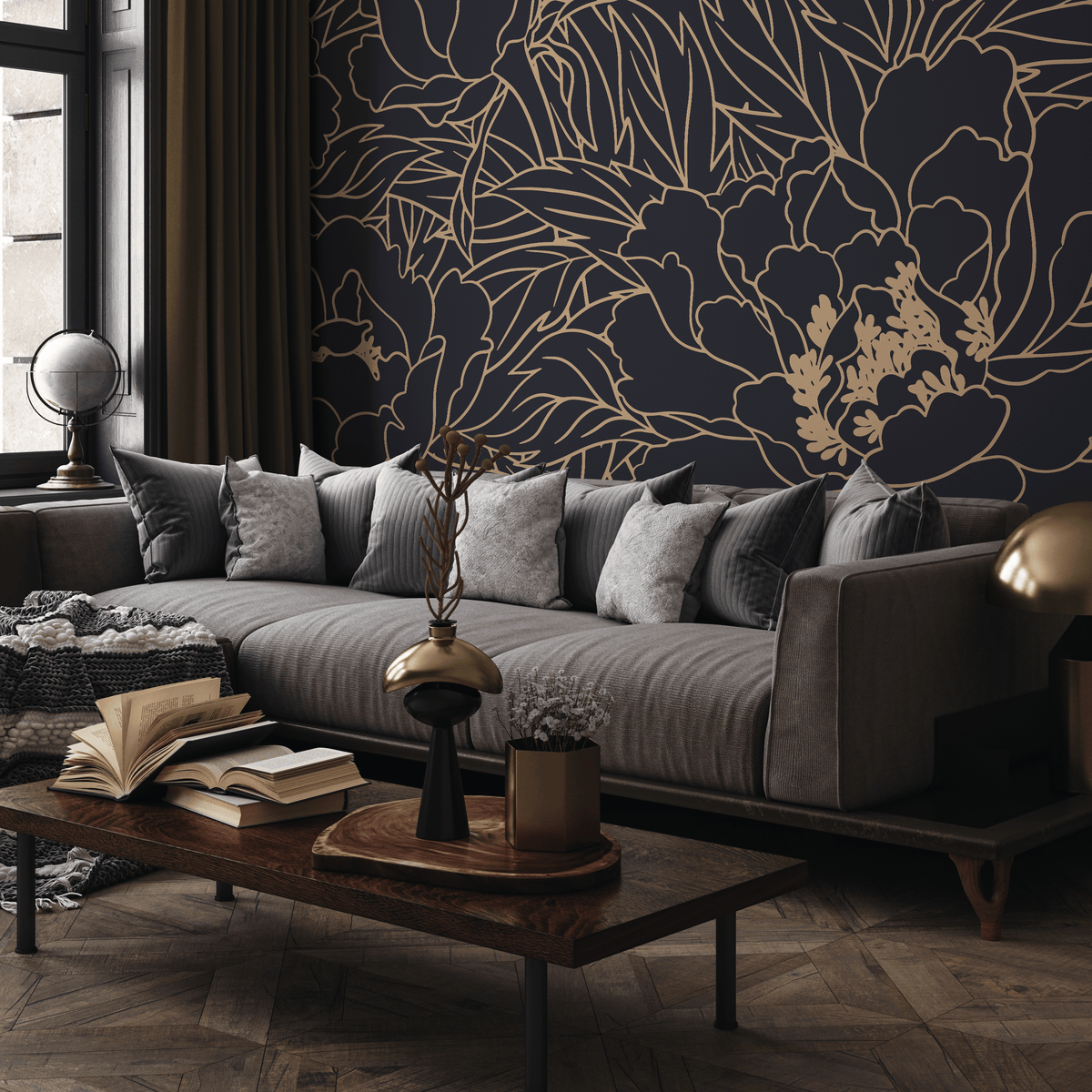 Introduce sophisticated drama to your home with our Floral Wallpaper, featuring elegant line art peonies in a striking dark blue and gold palette. This large-scale botanical wall art creates a luxurious and modern focal point, instantly elevating your interior design. The deep blue background contrasted with shimmering gold outlines provides a sense of depth and opulence, making it a perfect statement piece for any room.