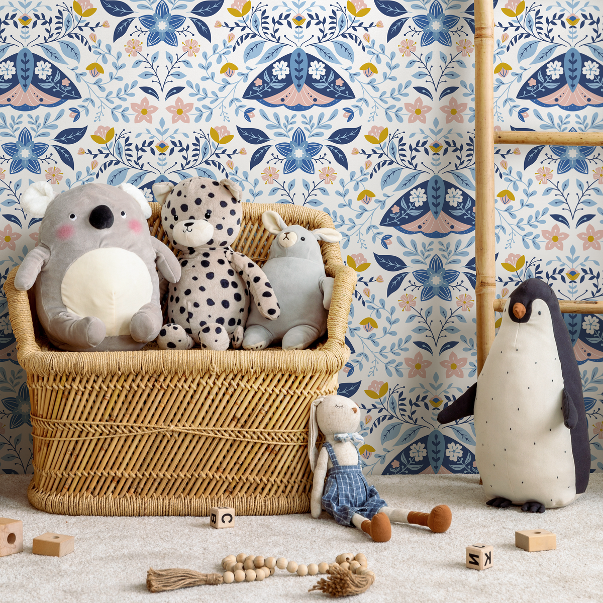 Introduce a touch of whimsical charm to your home with this stunning Floral Wallpaper. Featuring a captivating folk art moth motif, this design blends intricate blossoms and symmetrical insect patterns in a beautiful palette of blue, pink, and yellow. This premium removable wallpaper is perfect for creating an enchanting accent wall or transforming an entire room with its unique, nature-inspired aesthetic. The peel and stick format makes it an ideal choice for DIY home decor projects, allowing for a quick and easy style upgrade.