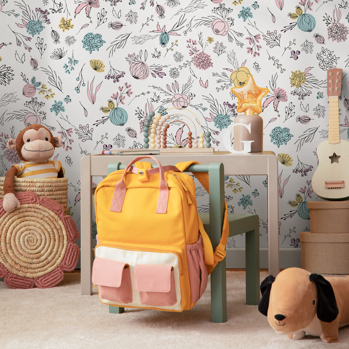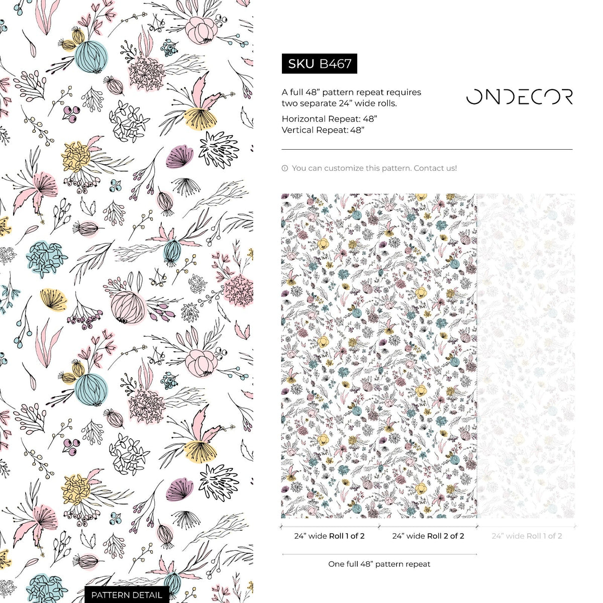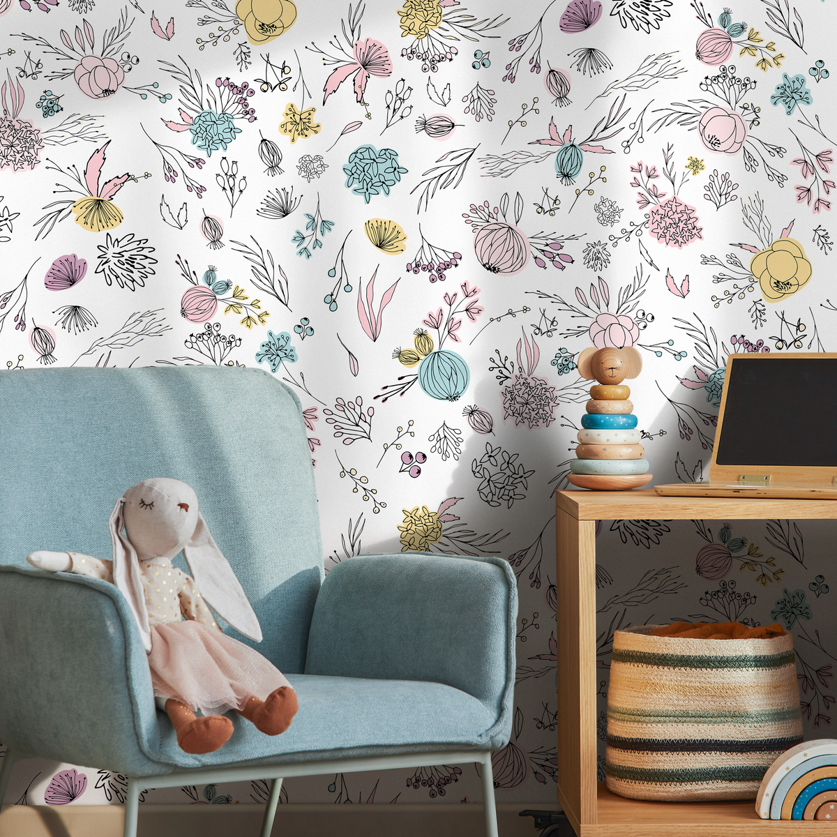 Introduce a touch of artistic charm to your home with this beautiful Floral Wallpaper, featuring delicate hand-drawn wildflowers. The charming design, rendered in soft shades of pink, blue, and yellow with crisp black line art, creates a whimsical and refreshing atmosphere. This peel and stick wallpaper is the perfect choice for anyone looking to infuse their interior design with a unique and elegant wall art statement.