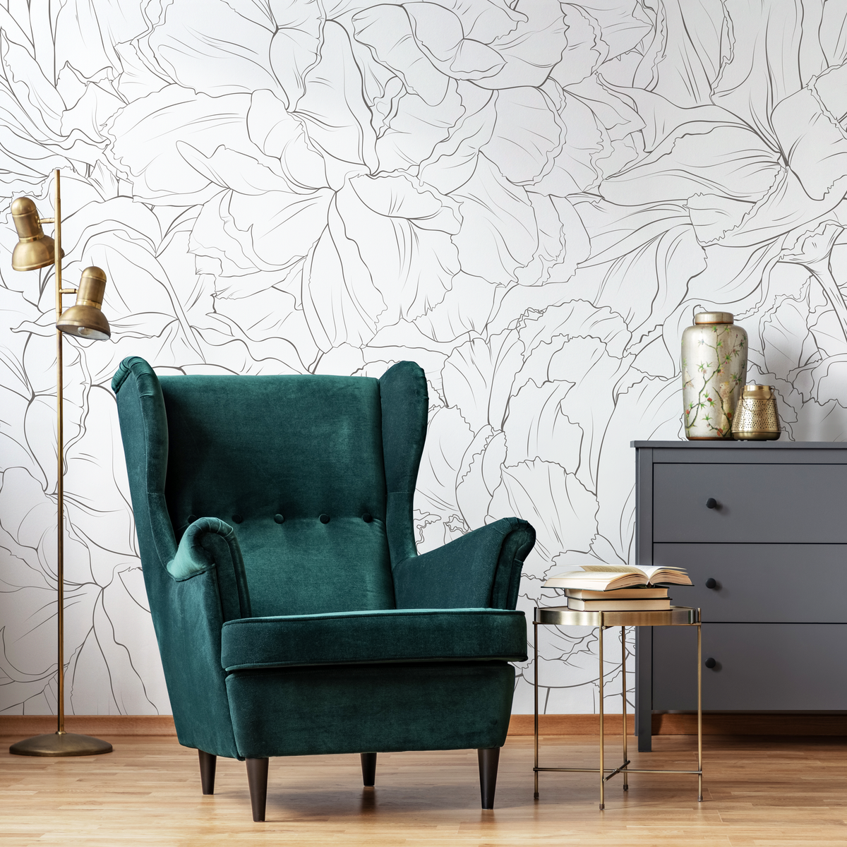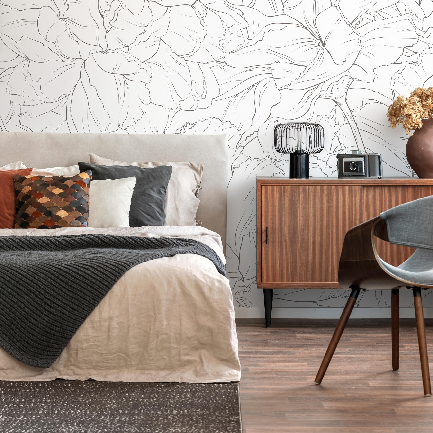 Introduce a touch of sophisticated charm to your home with this Floral Wallpaper, featuring minimalist peony outlines in a classic black and white color scheme. This large-scale mural offers a modern and elegant take on botanical wall art, perfect for creating a stunning accent wall. The delicate line art of the peonies provides a clean, contemporary look that enhances your interior design without overwhelming the space, making it a versatile choice for any room.