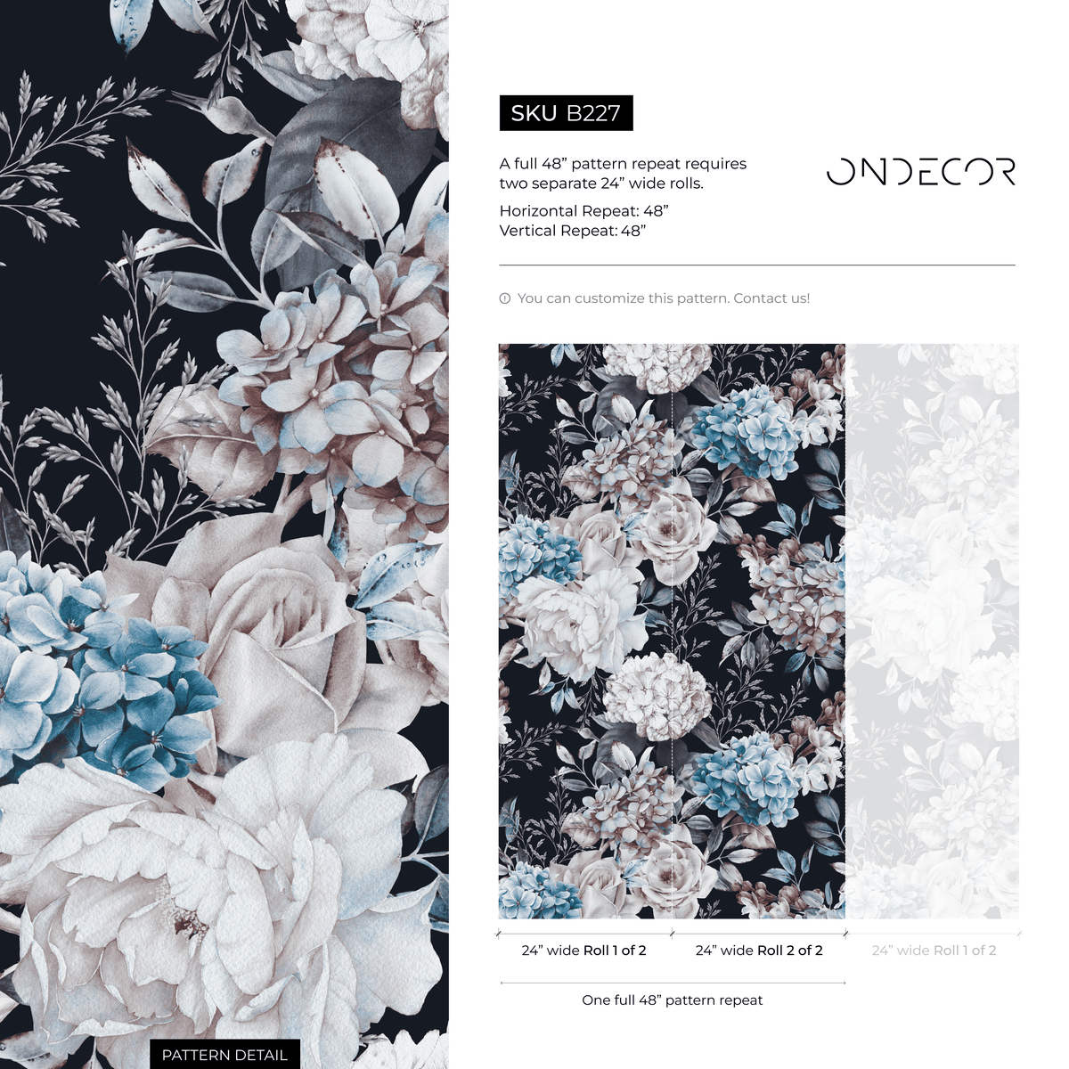 Elevate your home with our exquisite Floral Wallpaper, designed to create a dramatic and sophisticated atmosphere. This stunning wall art features oversized peonies and hydrangeas in soft shades of blue and white, set against a deep, moody background for a truly captivating effect. Perfect for anyone looking to introduce a touch of timeless elegance and botanical beauty into their interior design, this wallpaper serves as a breathtaking focal point.