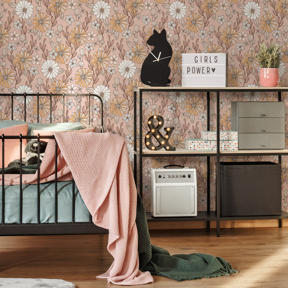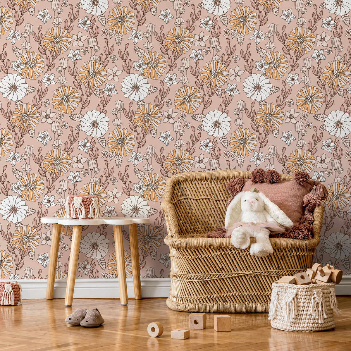 Introduce a touch of retro charm to your home with our Floral Wallpaper featuring a Retro Daisy Motif. This beautifully designed wall art captures a whimsical, bohemian spirit with its stylized daisies and wildflowers in soft shades of pink, yellow, and white. Perfect for creating a warm and inviting atmosphere, this wallpaper serves as a stunning piece of home decor, instantly elevating any interior design scheme. Whether you're looking to create a captivating accent wall or envelop an entire room in its gentle floral embrace, this design offers a timeless yet modern aesthetic.