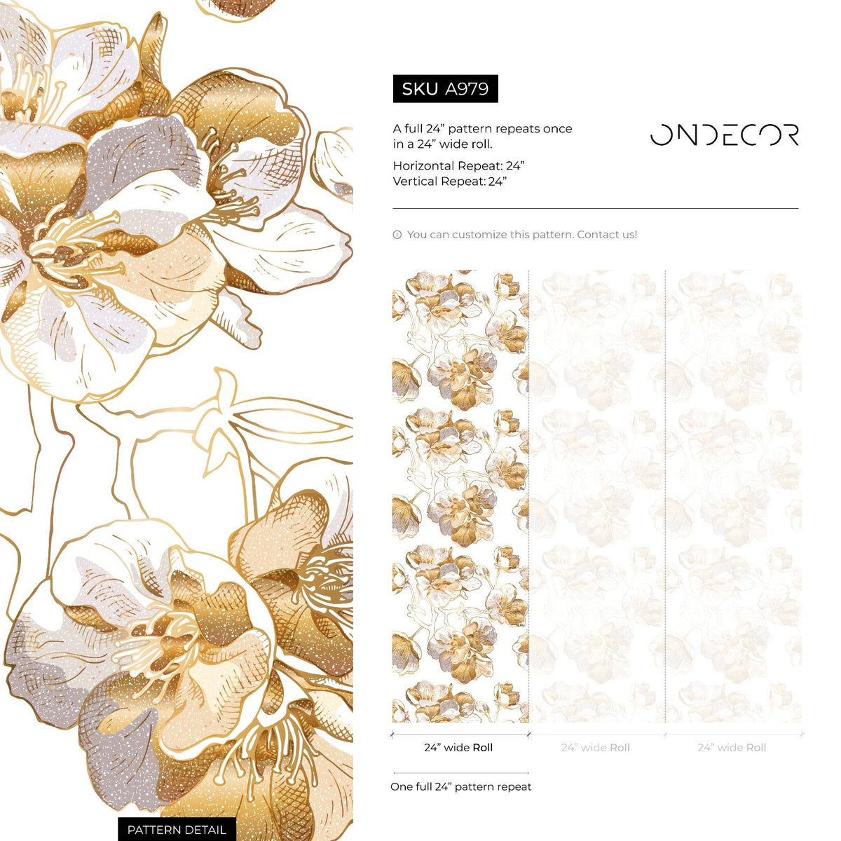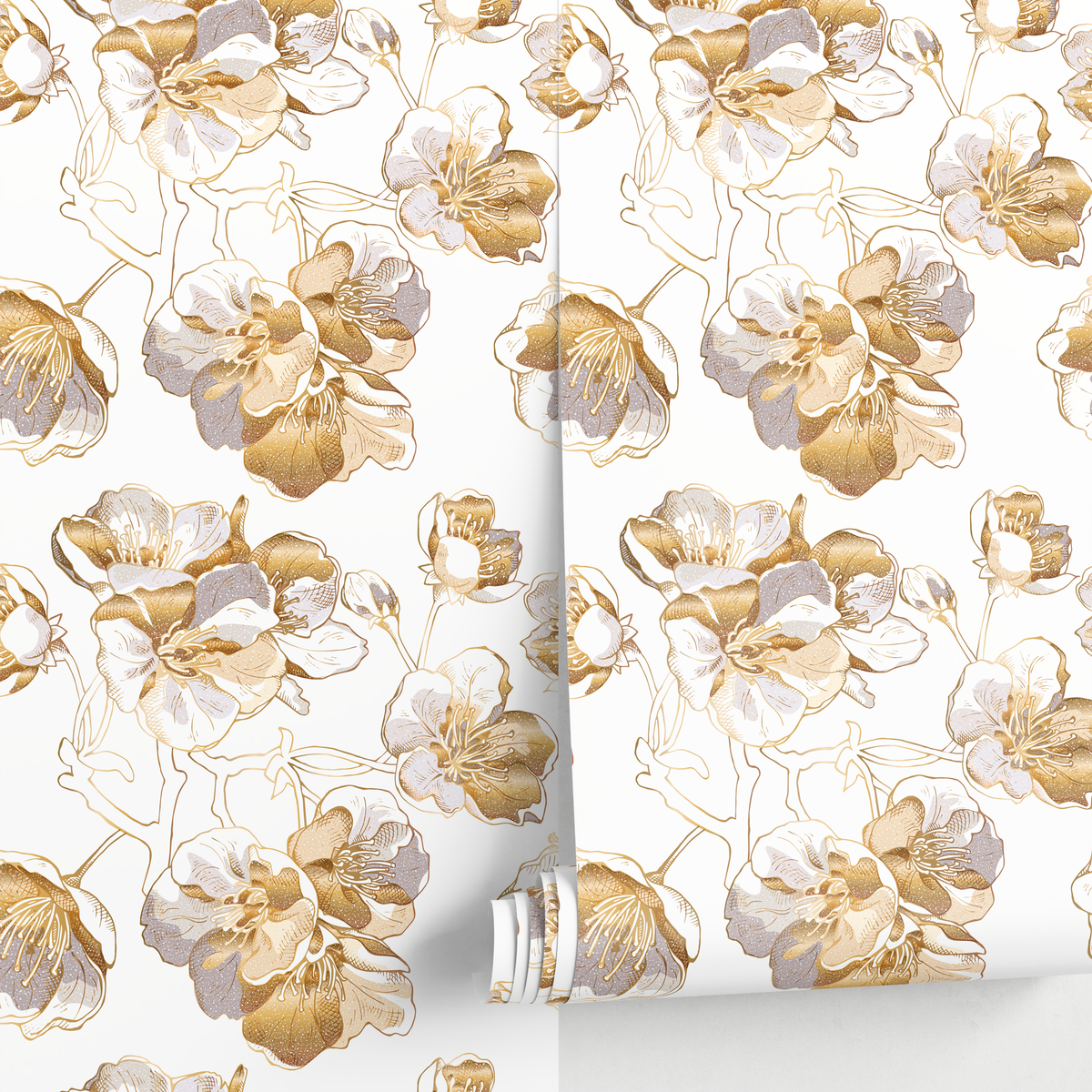 Elevate your interior with this stunning Floral Wallpaper, featuring elegant stylized blossoms in Gold and Gray. This design brings a touch of sophisticated, minimalist charm to any room, making it a perfect choice for creating a serene and stylish atmosphere. The delicate gold line art offers a modern take on botanical home decor, blending seamlessly into contemporary and Scandinavian-inspired spaces.