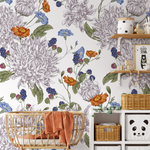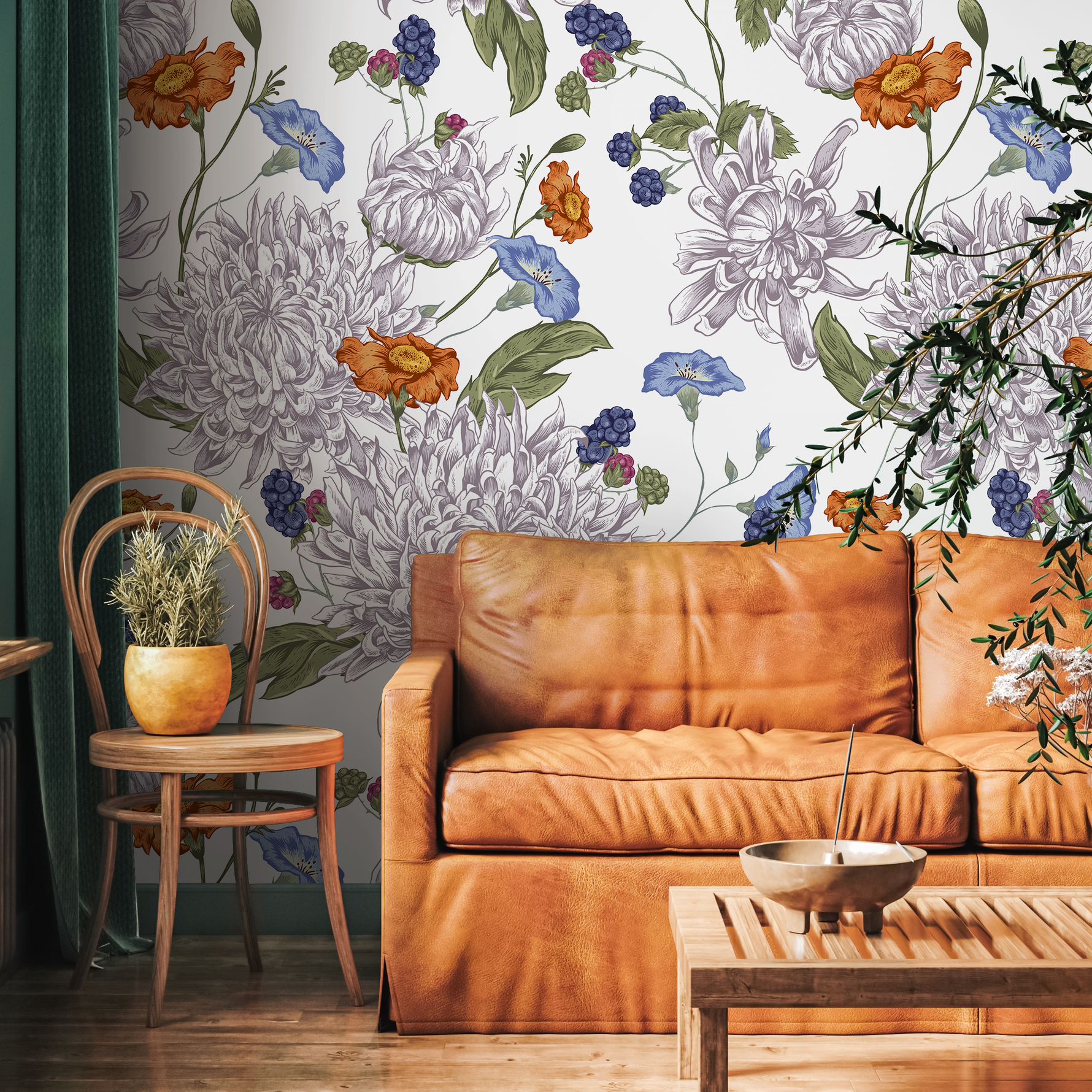 Transform your interior with this stunning Floral Wallpaper, featuring beautifully detailed vintage chrysanthemums. The elegant design, rendered in a sophisticated palette of purple, orange, and blue, brings a classic botanical charm to any room. This high-quality wall art is perfect for creating a dramatic accent wall or enveloping an entire space in timeless beauty, making it an exceptional choice for your next home decor project.