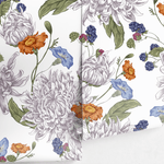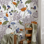 Floral Wallpaper with Vintage Chrysanthemums in Purple, Orange, and Blue - A628