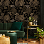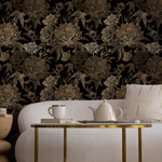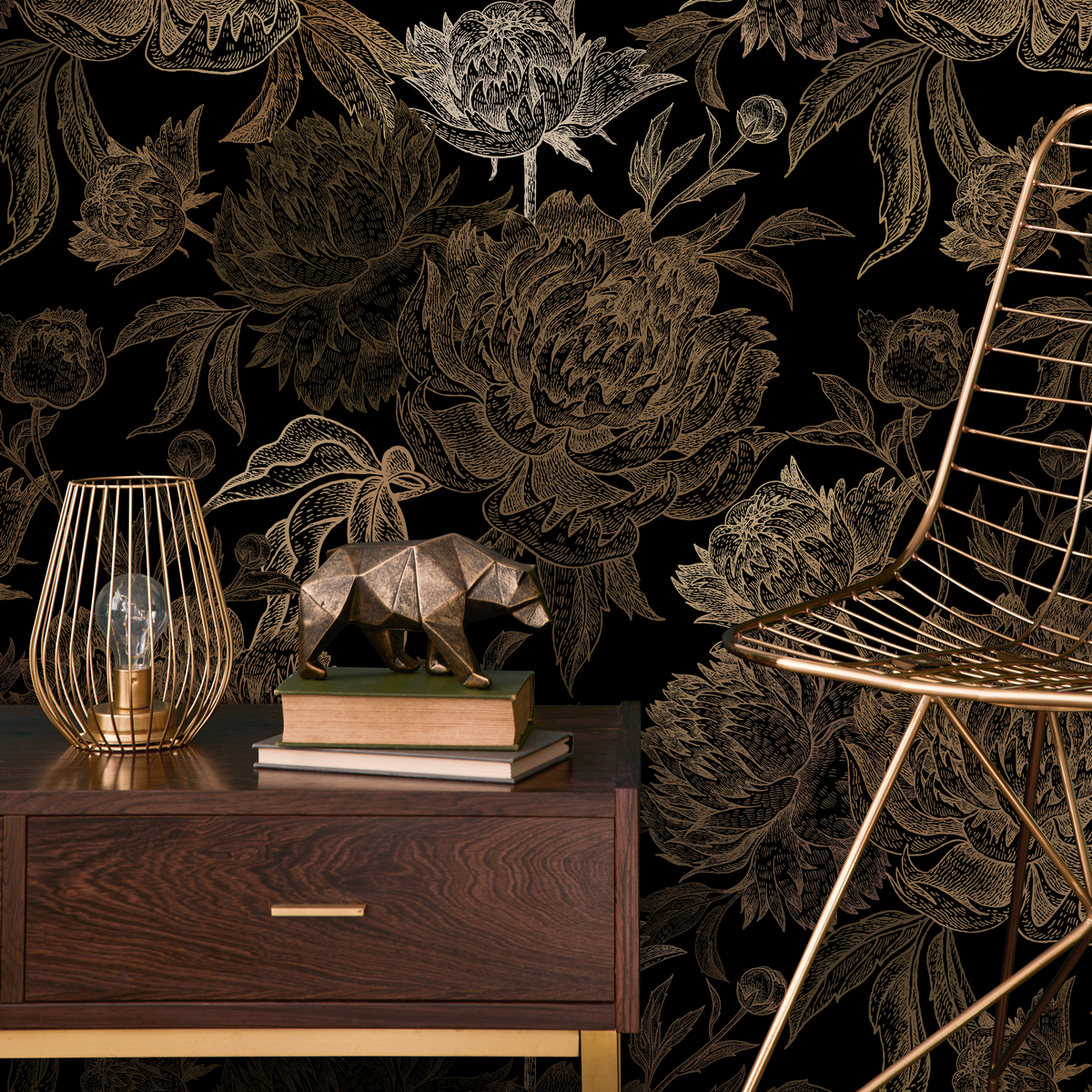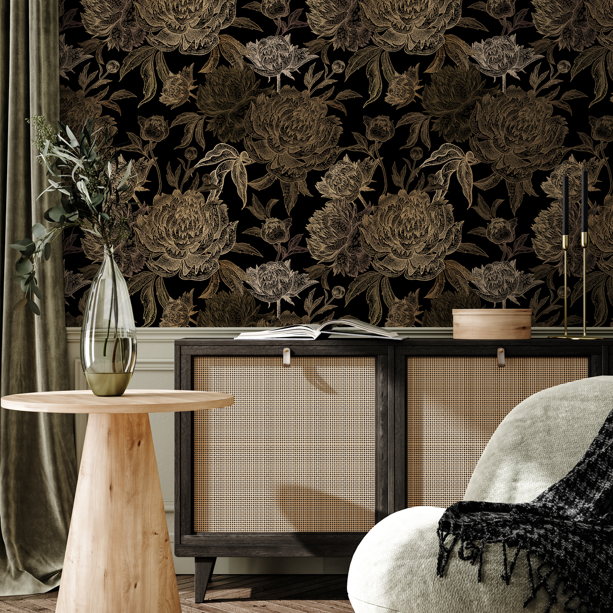 Elevate your interior with this stunning Floral Wallpaper, featuring a sophisticated vintage peony motif. The dramatic black and gold color scheme brings a touch of luxury and depth to any room, creating an unforgettable statement piece. This elegant botanical design is perfect for anyone looking to infuse their home decor with timeless style and artistic flair, transforming plain walls into captivating works of wall art.