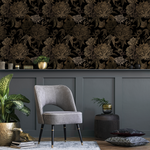 Floral Wallpaper with a Vintage Peony Motif in Black and Gold - B665