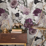 Introduce a touch of dramatic elegance to your home with this Floral Wallpaper, featuring a stunning arrangement of vintage roses and ferns. The moody and romantic composition, presented in rich purples, deep blacks, and soft whites, serves as sophisticated wall art that transforms any room. This design is perfect for creating an enchanting and timeless atmosphere, making it a standout piece of home decor.