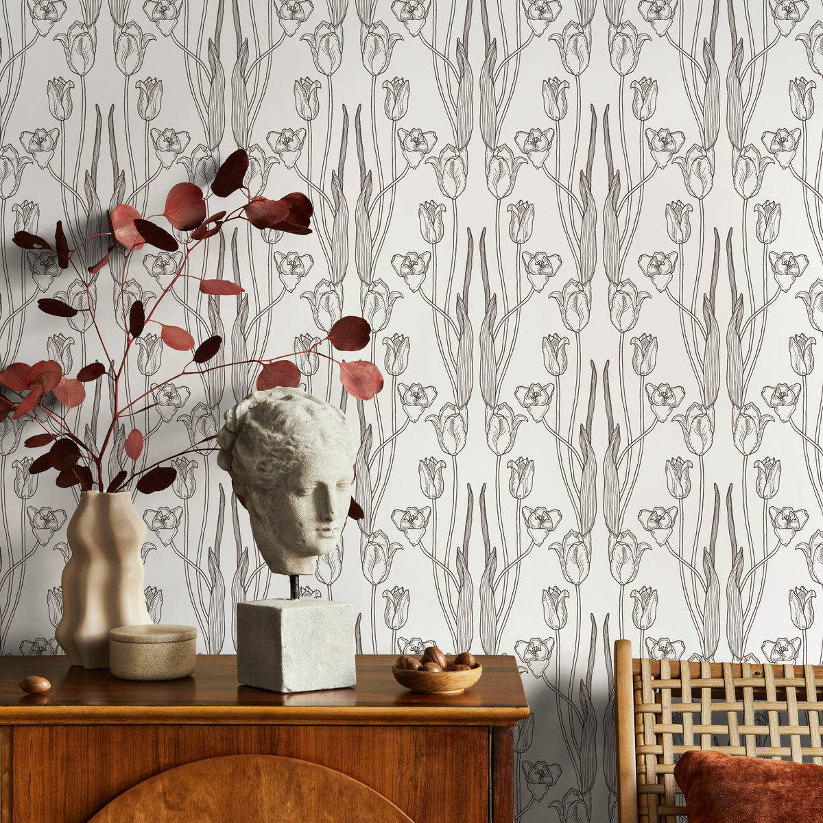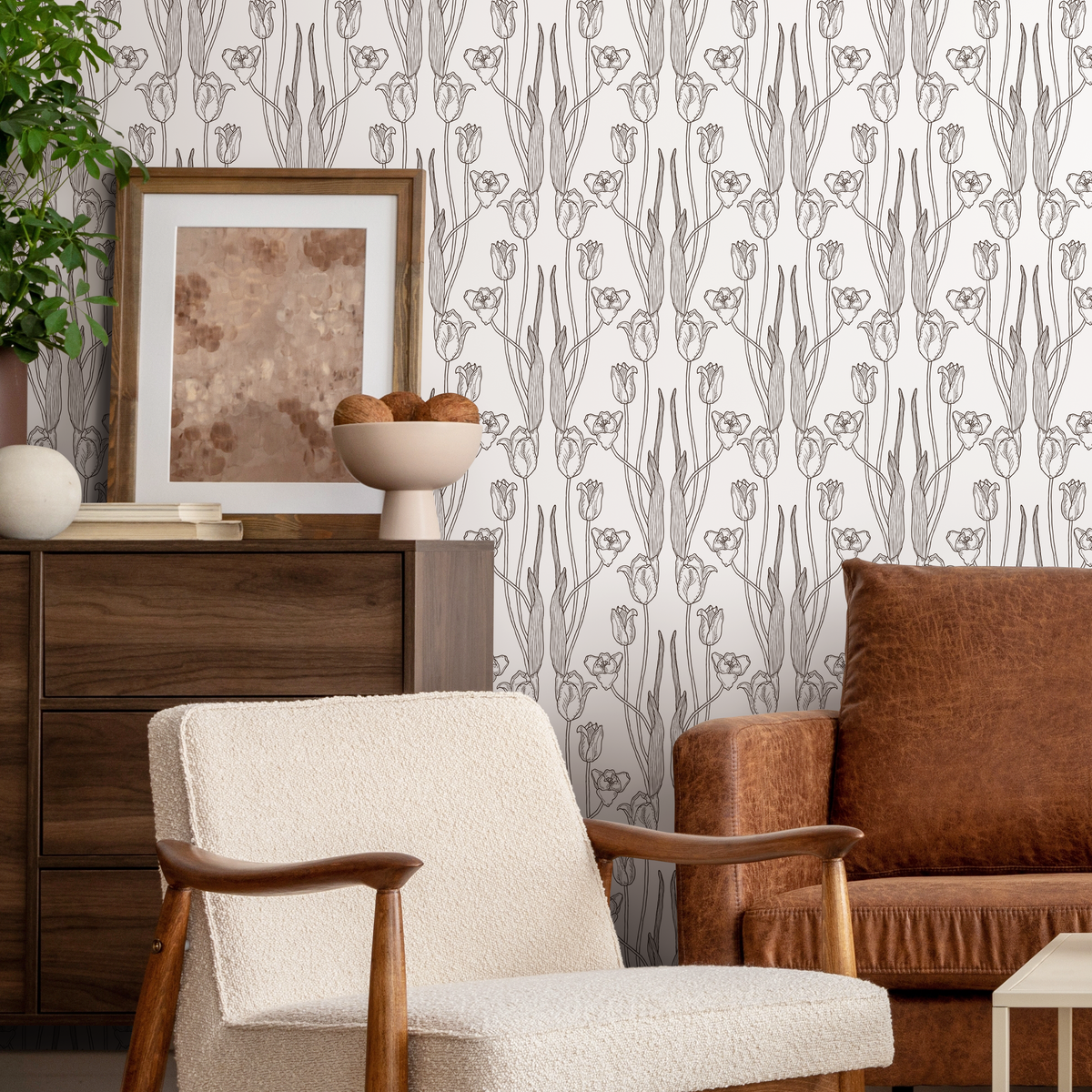 Introduce timeless elegance to your home with our Floral Wallpaper, featuring a sophisticated vintage tulip line art design. This stunning black and white wallpaper offers a classic yet minimalist aesthetic, perfect for creating a statement wall or transforming an entire room. The delicate, hand-drawn appearance of the tulips brings a touch of nature-inspired artistry to your interior design, making it a versatile choice for any space.