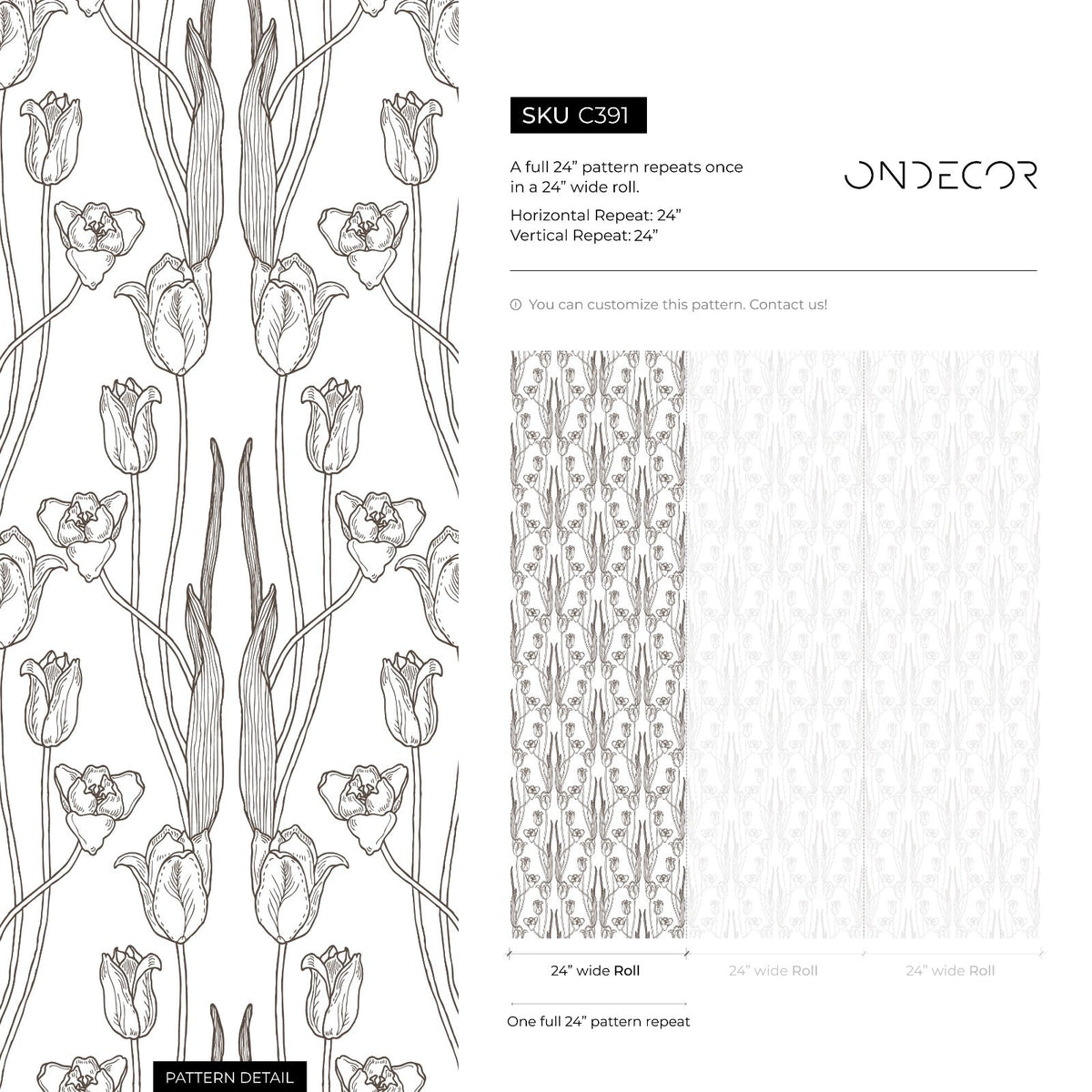 Floral Wallpaper with Vintage Tulip Line Art in Black and White - C391
