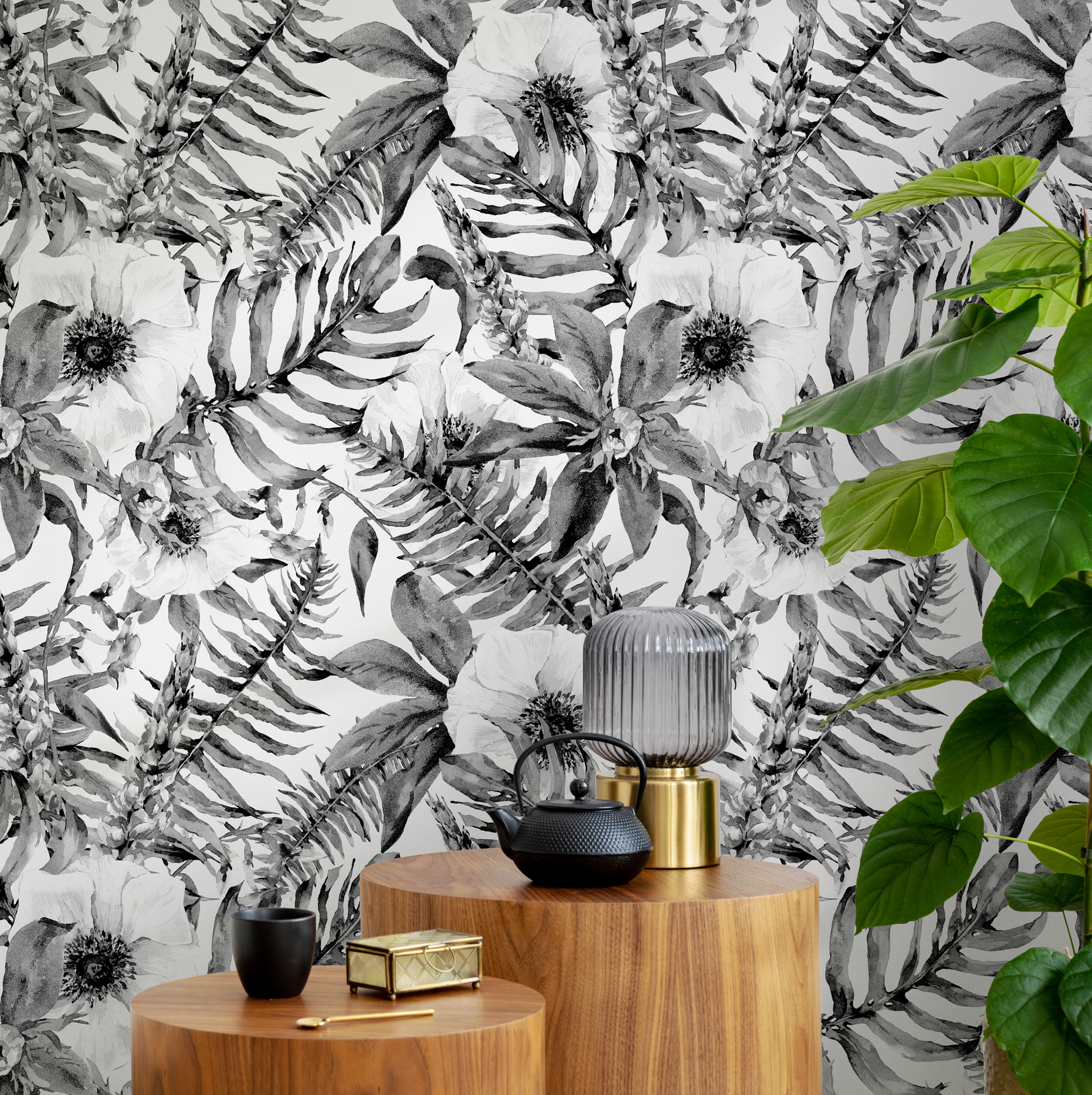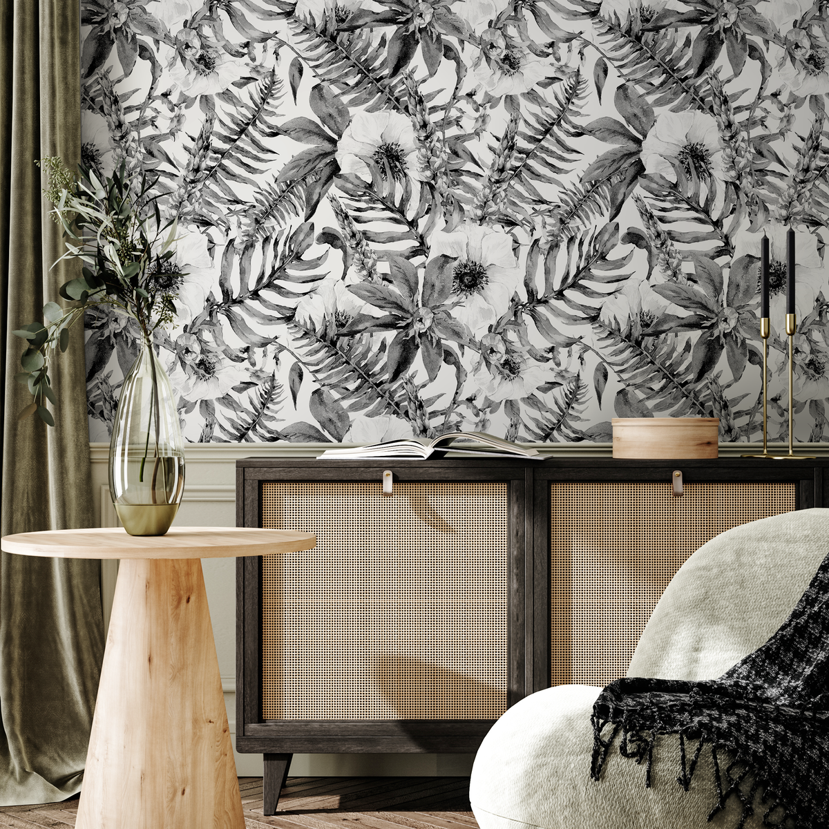Introduce a touch of dramatic elegance to your home with this stunning Floral Wallpaper, featuring a sophisticated watercolor design of anemones and ferns. Rendered in a classic black and white palette, this wallpaper serves as a captivating piece of wall art, perfect for creating a statement accent wall or transforming an entire room. The intricate botanical details offer a timeless appeal, seamlessly blending with various interior design themes. This versatile design is ideal for anyone looking to elevate their home decor with a chic and artistic touch.