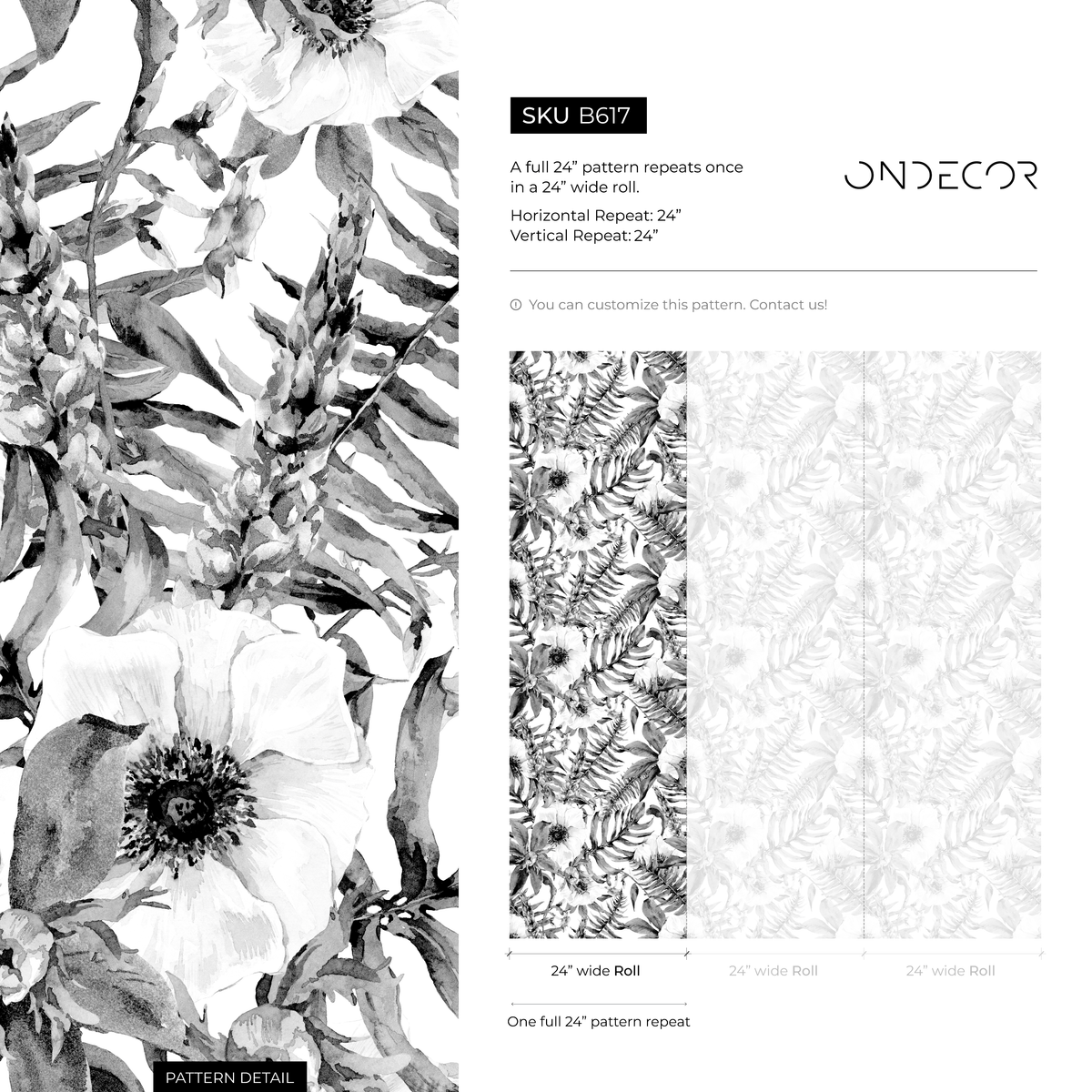 Crafted for convenience and style, our removable wallpaper makes room makeovers effortless. The premium peel and stick material allows for a simple, mess-free application, making it a fantastic choice for both homeowners and renters. This high-quality wall decor is not only beautiful but also durable and long-lasting. Whether you're updating your living room, bedroom, or entryway, this black and white floral wallpaper provides a perfect solution for sophisticated and modern interior design.