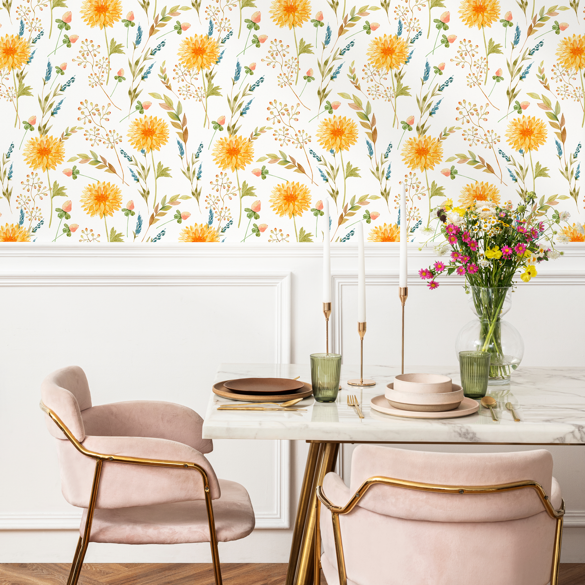 Introduce the charm of a sunlit meadow into your home with our Floral Wallpaper. This exquisite wall art features delicate watercolor chrysanthemums blooming in cheerful yellow, complemented by sprigs of blue and lush green foliage. The hand-painted aesthetic of this botanical design brings a soft, artistic touch to any space, creating a serene and inviting atmosphere. It's the perfect choice for anyone looking to add a touch of nature's beauty to their interior design.