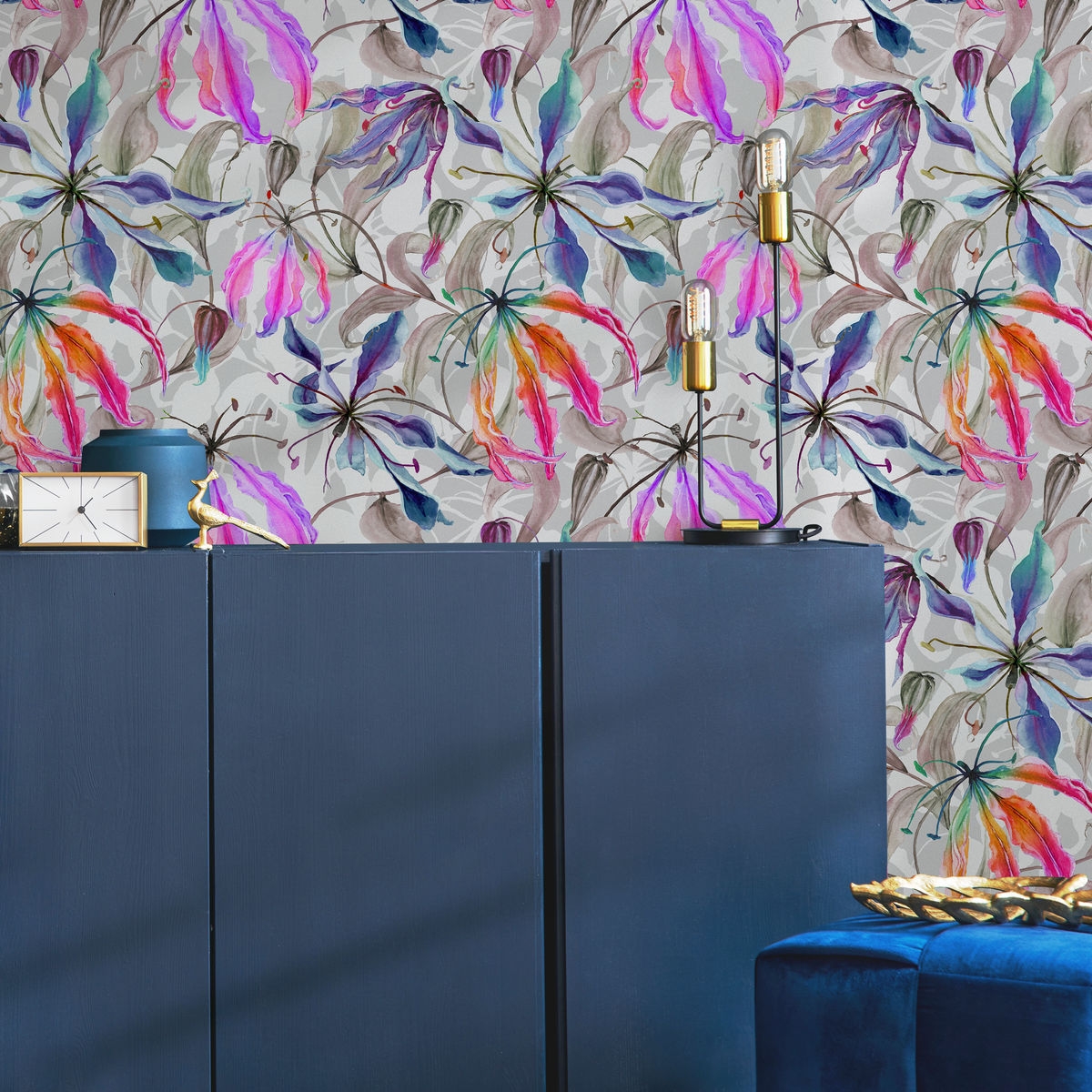 Introduce a burst of artistic elegance to your home with our Floral Wallpaper with Watercolor Glory Lilies. This stunning wall art features a captivating design of exotic flowers in vibrant shades of pink, purple, and blue, set against a subtle, light gray background. Perfect for creating a dramatic accent wall or transforming an entire room, this wallpaper brings a touch of modern botanical beauty to any interior design.
