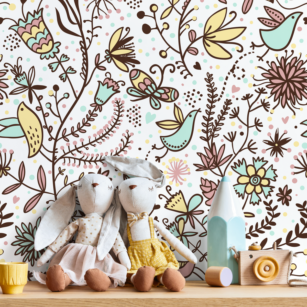 Introduce a touch of enchantment to your home with our Folk Art Wallpaper, designed with whimsical birds and flowers. This charming wall art, featuring a delightful palette of brown, pink, and blue, is perfect for creating an imaginative and joyful atmosphere in any room. The intricate, hand-drawn style design adds a unique and heartwarming character, transforming your space into a storybook scene.