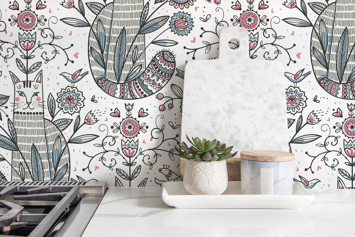 Introduce a touch of whimsy to your home with this Folk Art Wallpaper, featuring a delightful pattern of cats and birds. The charming design, rendered in a soft palette of pink, blue, and black, creates a captivating and unique wall art statement. Perfect for bringing personality to any room, this wallpaper serves as a beautiful backdrop that sparks joy and creativity, making it an excellent choice for an imaginative home decor theme.