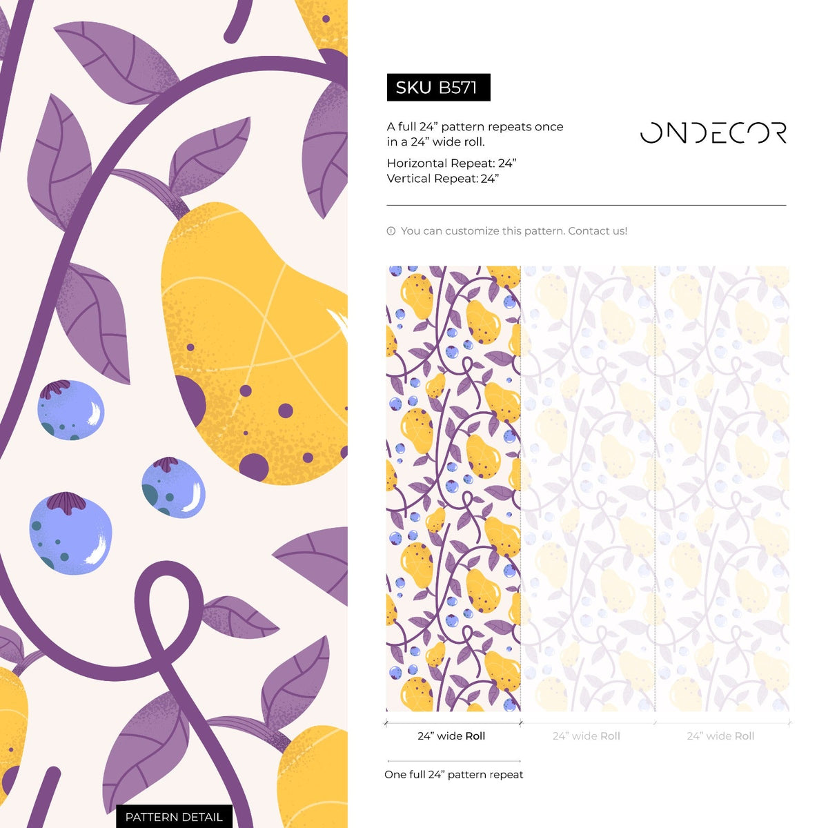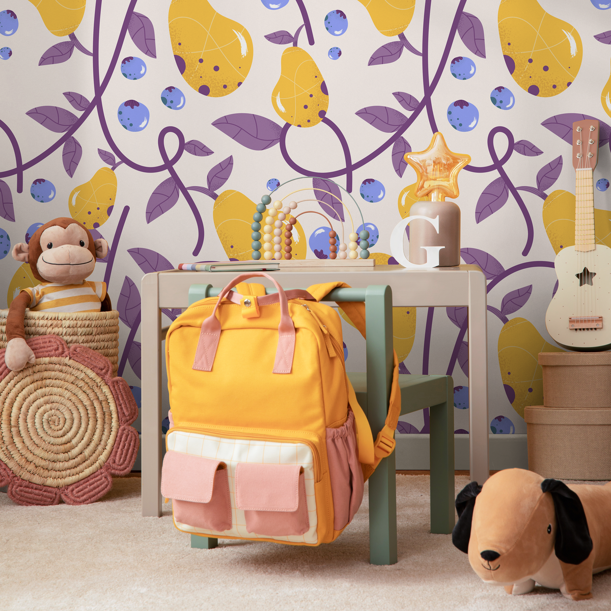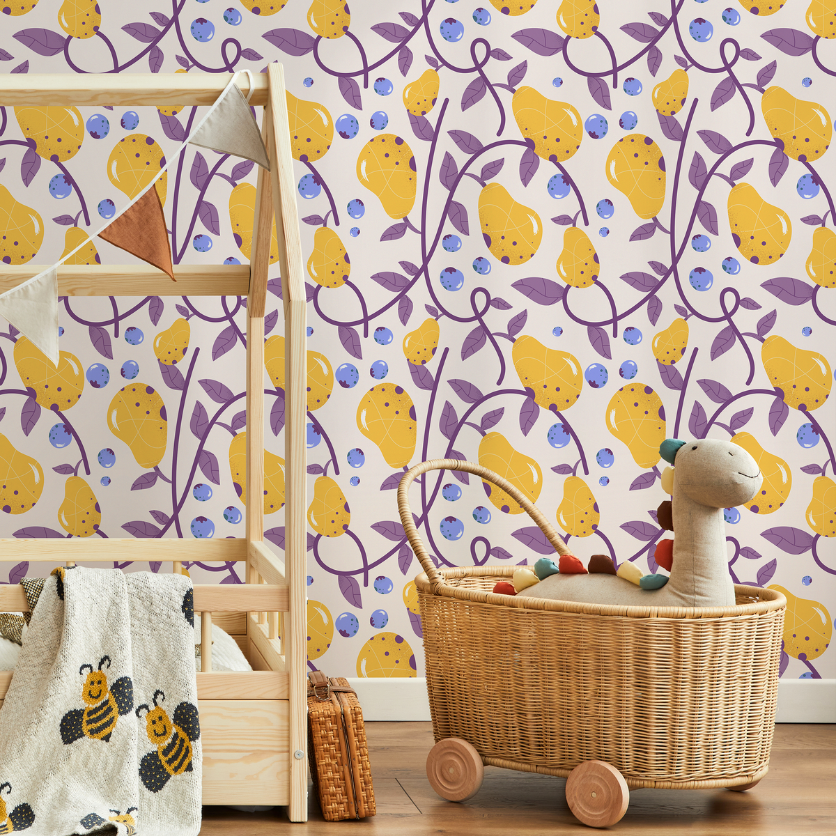 Introduce a touch of whimsical charm to your home with our Fruit Wallpaper featuring delightful pear and berry vines. This peel and stick wallpaper, presented in a cheerful palette of yellow, purple, and blue, is perfect for creating a bright and inviting atmosphere. The playful botanical design serves as a stunning piece of wall art, ideal for transforming any room into a lively, stylish space. Whether you're looking for kitchen decor or a unique accent wall, this design brings a fresh and happy feel to your interior design.