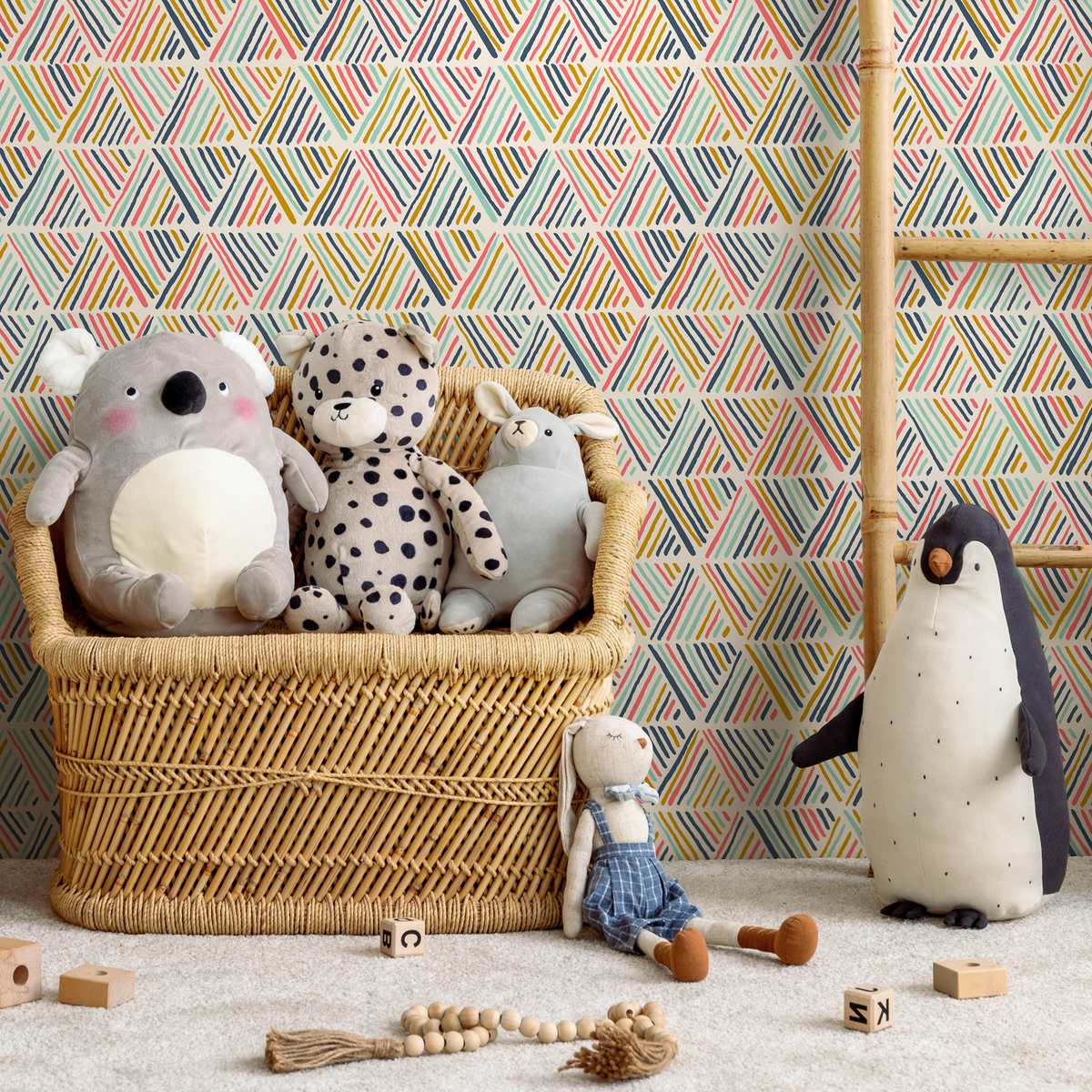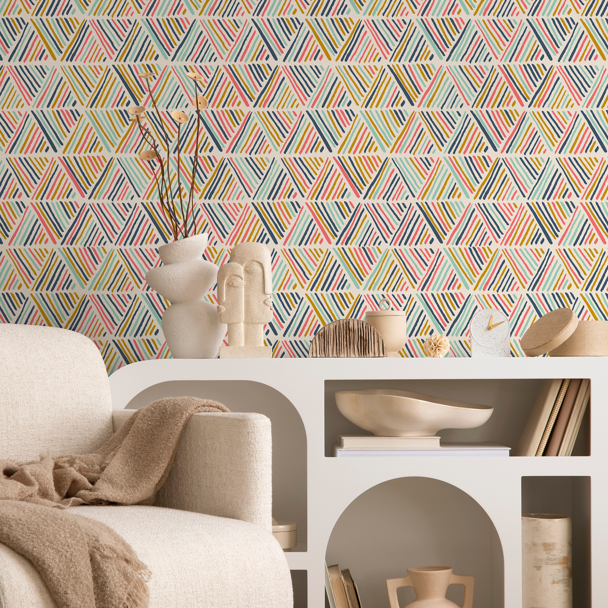 Introduce a pop of color and modern energy with our Geometric Wallpaper, featuring abstract striped triangles. This dynamic wall art, with its lively Pink, Blue, and Yellow palette, is perfect for creating a statement wall that reflects a bold and artistic interior design. The unique pattern adds a touch of playful sophistication to any room, instantly elevating your home decor.