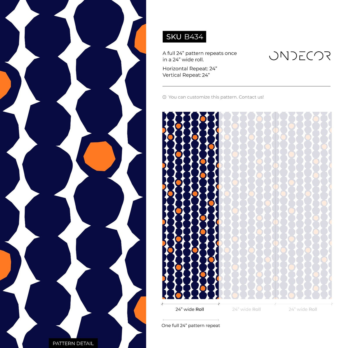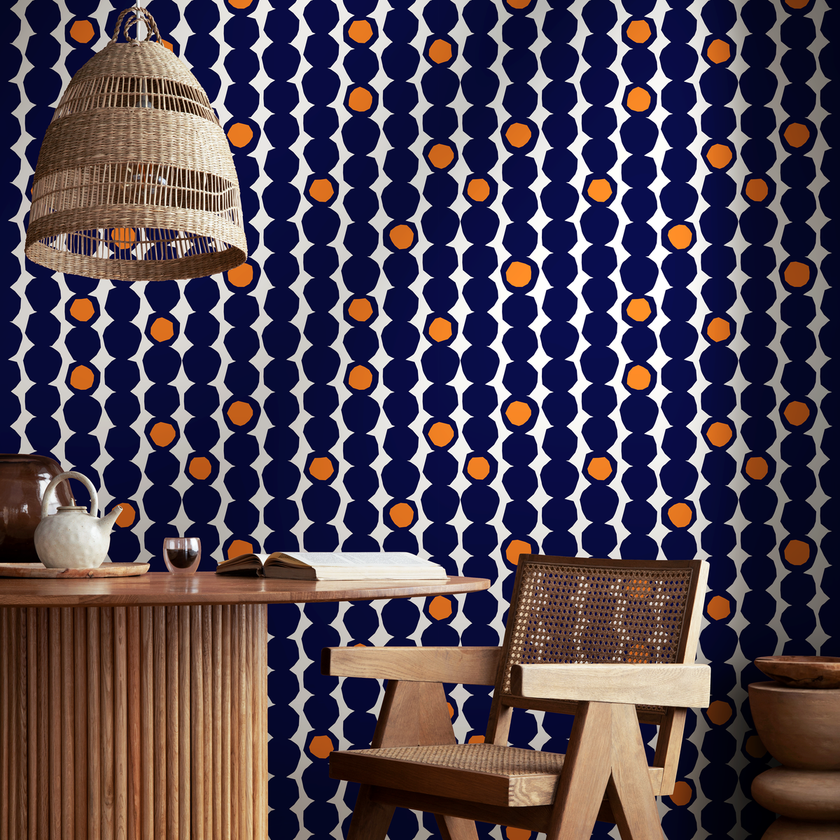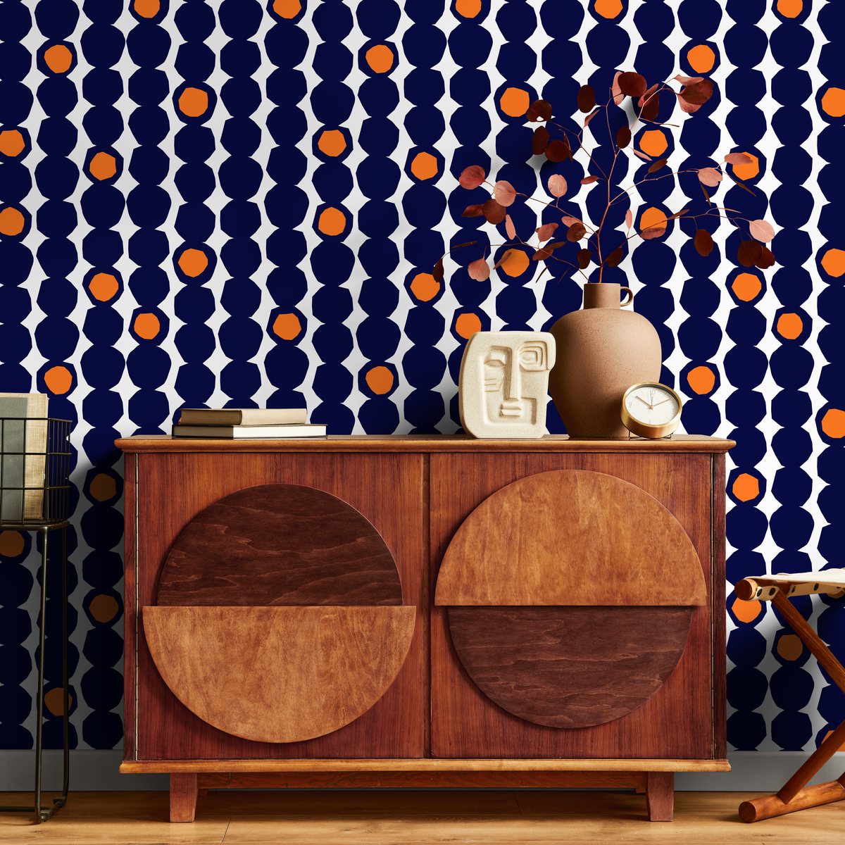Introduce a bold, retro-inspired aesthetic to your space with this Geometric Wallpaper, featuring a striking pattern of faceted circles in deep navy blue and vibrant orange. This eye-catching design is perfect for creating a dynamic accent wall or revitalizing an entire room with its unique, stacked dot motif. The rich color palette offers a sophisticated yet energetic touch, making it an ideal choice for modern and mid-century interior design styles.